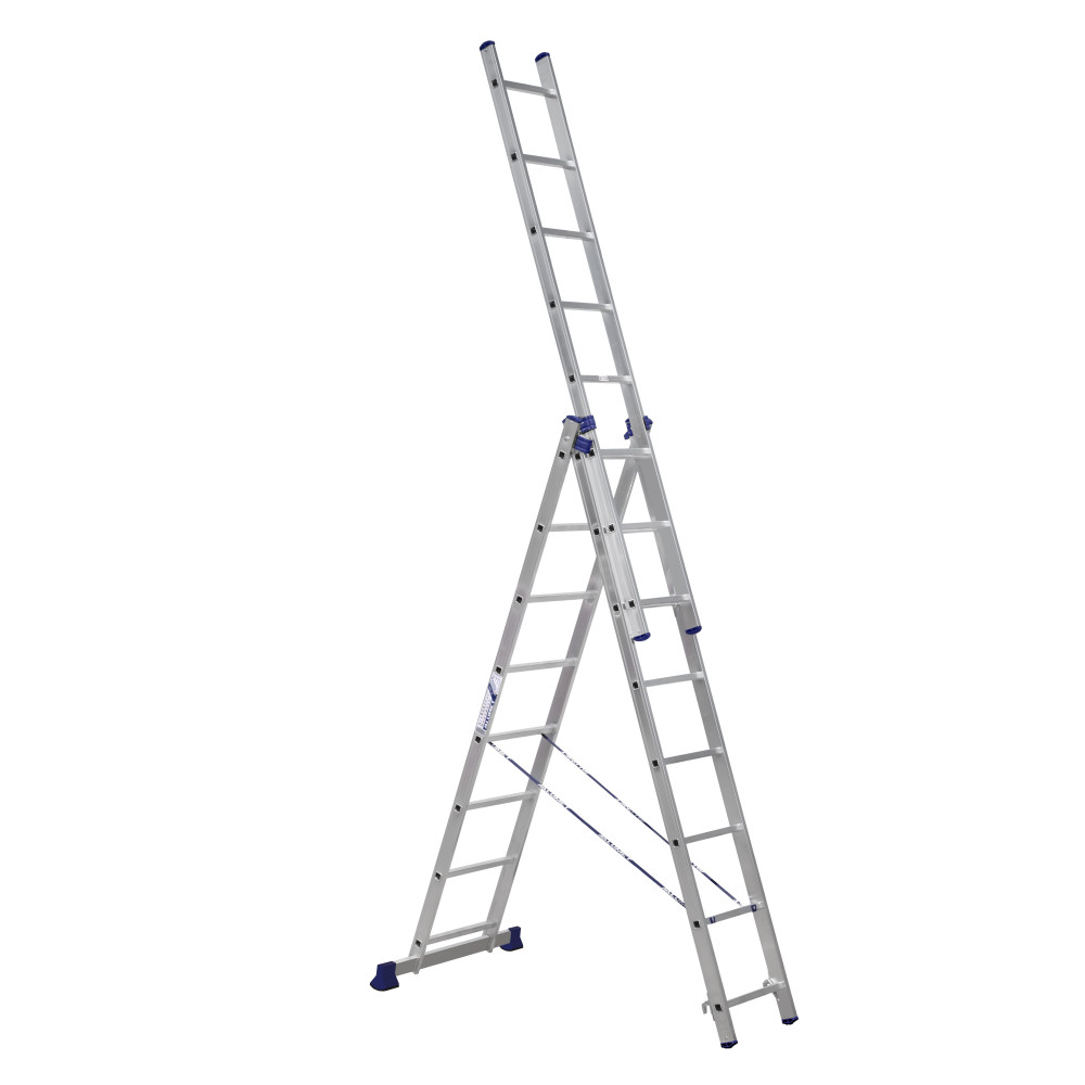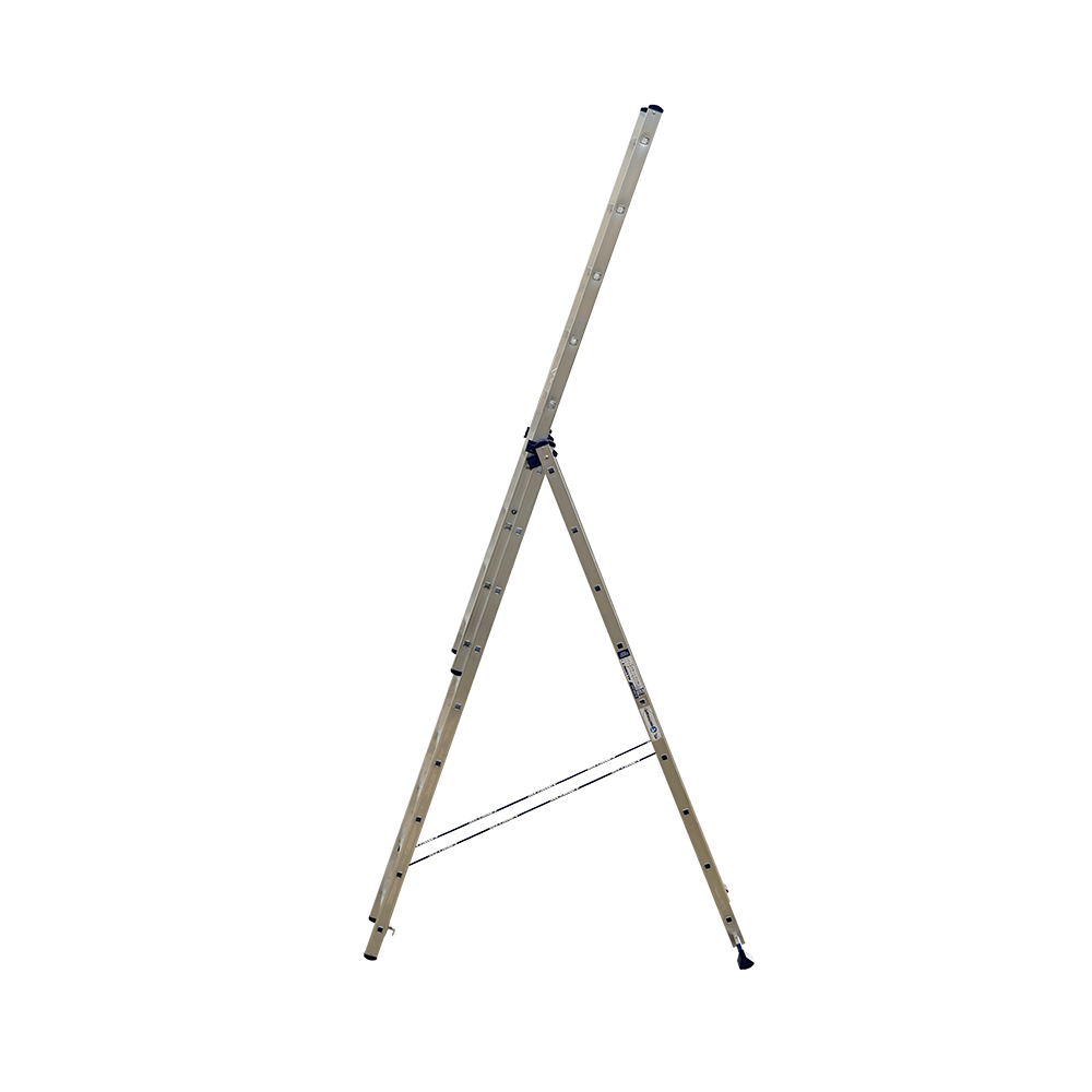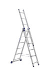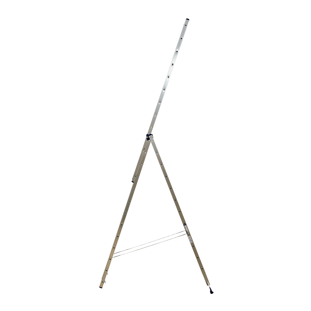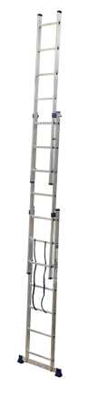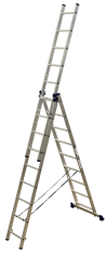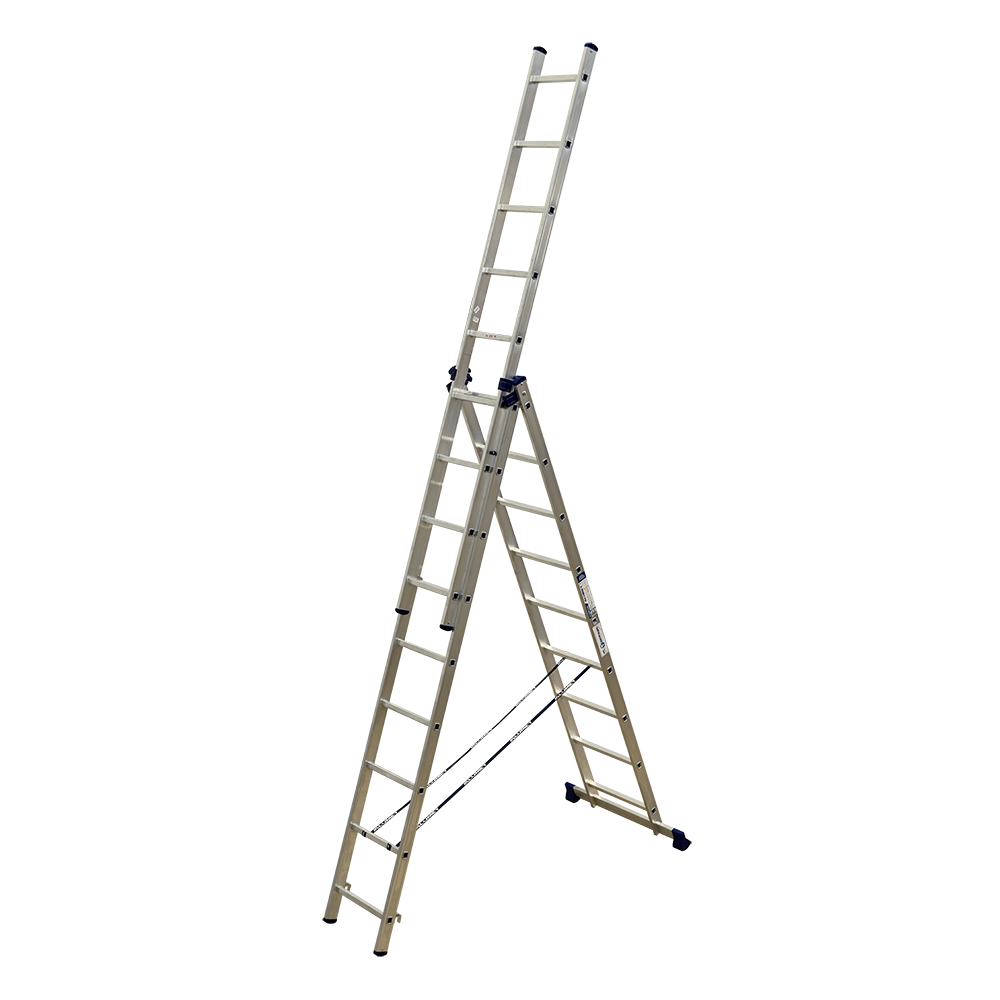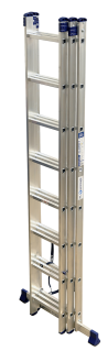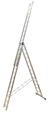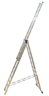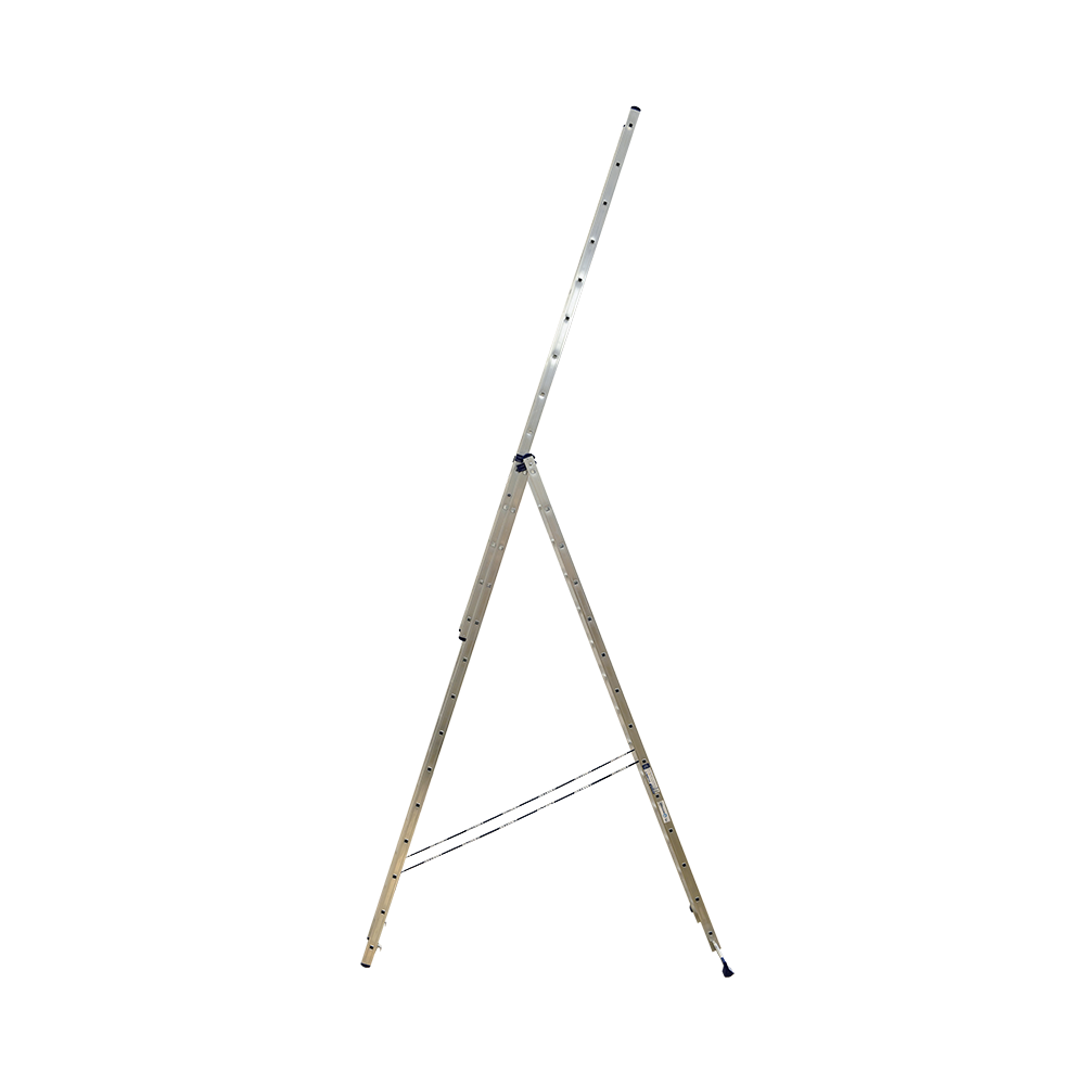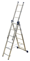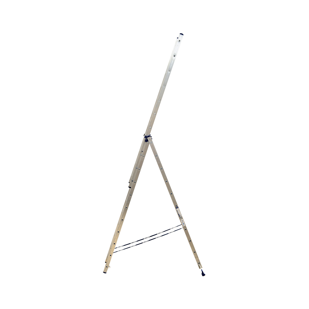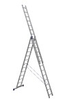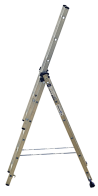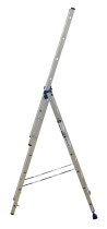 Универсальность данной лестницы заключается в том, что она может использоваться как раздвижная приставная лестница из трех частей и как свободностоящая стремянка (перевернутая русская буква «У»). Более того третья секция является съемной, и ею можно пользоваться отдельно как приставной лестницей, а оставшаяся часть при этом представляет двухсекционную универсальную лестницу. Эта лестница является по праву наиболее универсальной из всех лестниц, и несмотря на необходимый попарный перехлест секций как в конфигурации «приставная лестница» так и в конфигурации «стремянка», что усложняет, утяжеляет и поэтому удорожает ее, является самой популярной по продаваемости из-за своей исключительной универсальности.