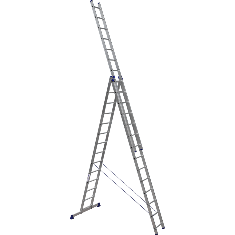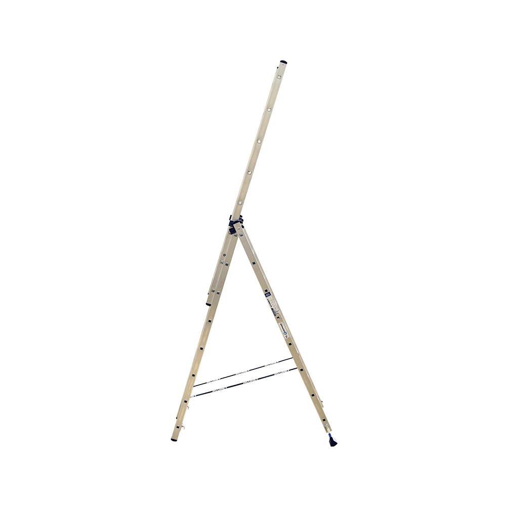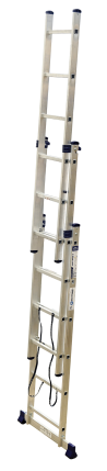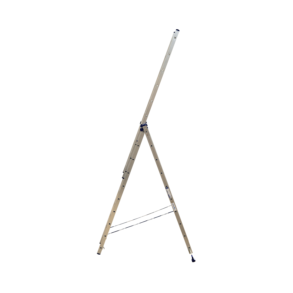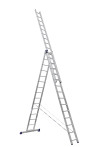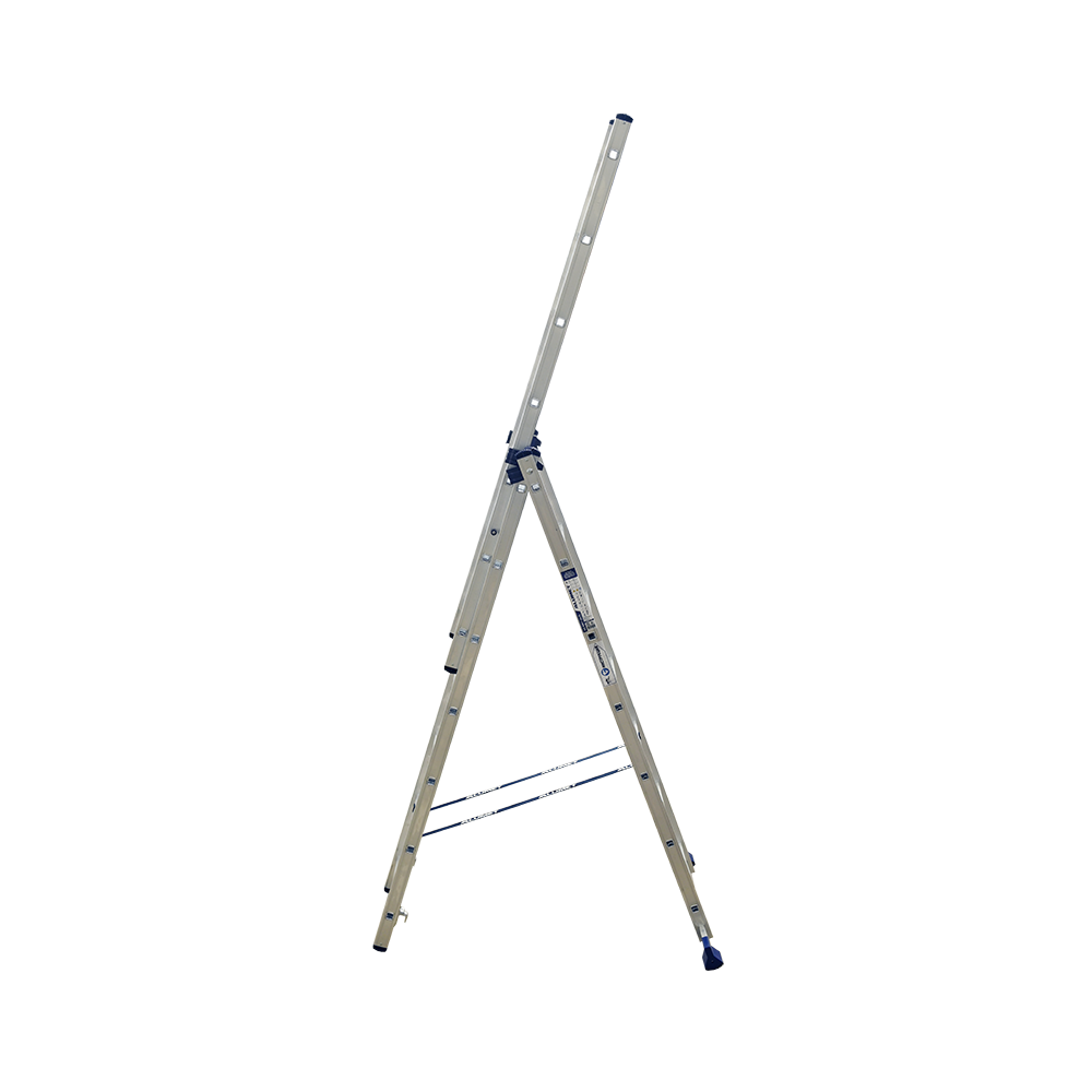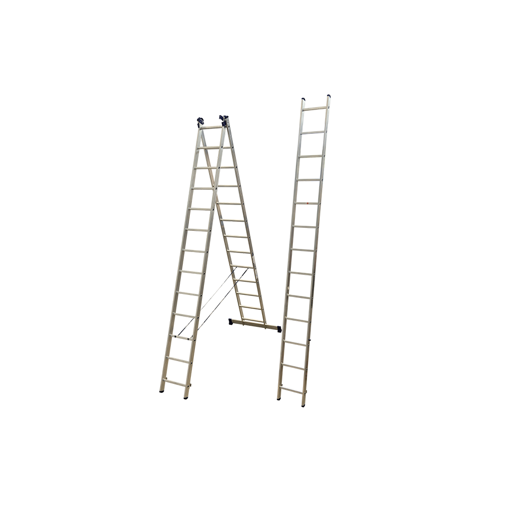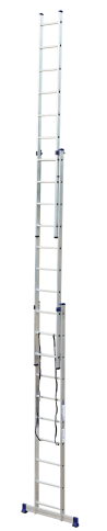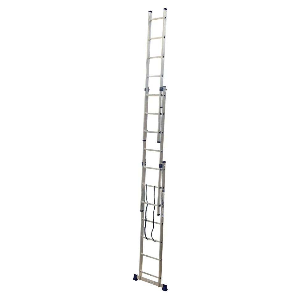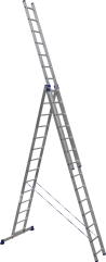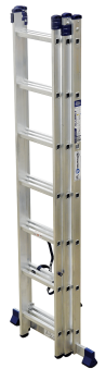 Универсальность данной лестницы заключается в том, что она может использоваться как раздвижная приставная лестница из трех частей и как свободностоящая стремянка (перевернутая русская буква «У»). Более того третья секция является съемной, и ею можно пользоваться отдельно как приставной лестницей, а оставшаяся часть при этом представляет двухсекционную универсальную лестницу. Эта лестница является по праву наиболее универсальной из всех лестниц, и несмотря на необходимый попарный перехлест секций как в конфигурации «приставная лестница» так и в конфигурации «стремянка», что усложняет, утяжеляет и поэтому удорожает ее, является самой популярной по продаваемости из-за своей исключительной универсальности.