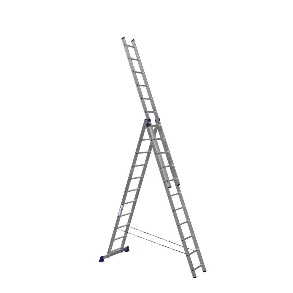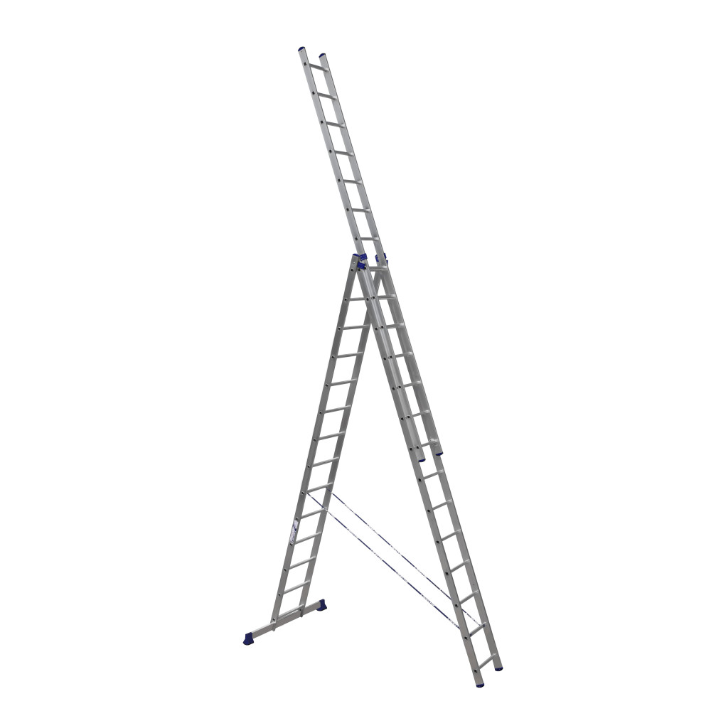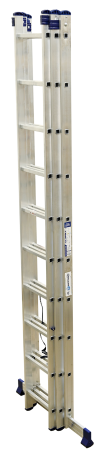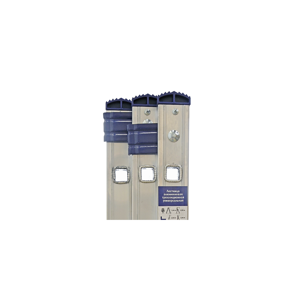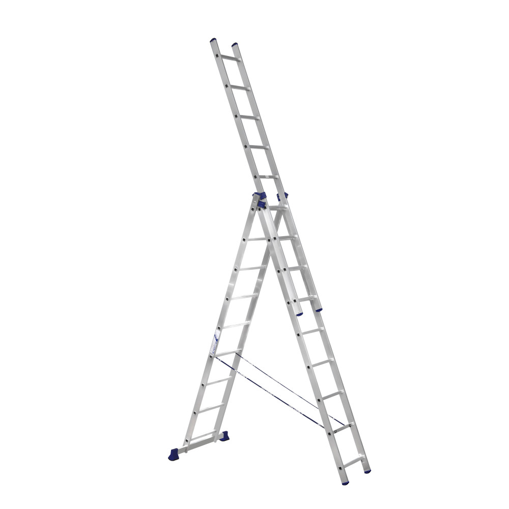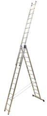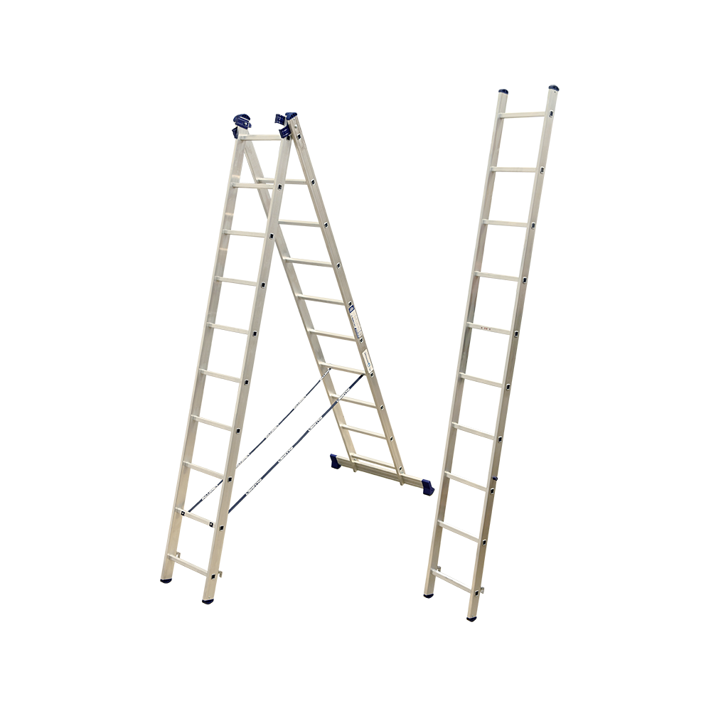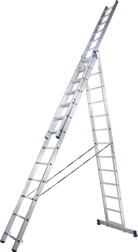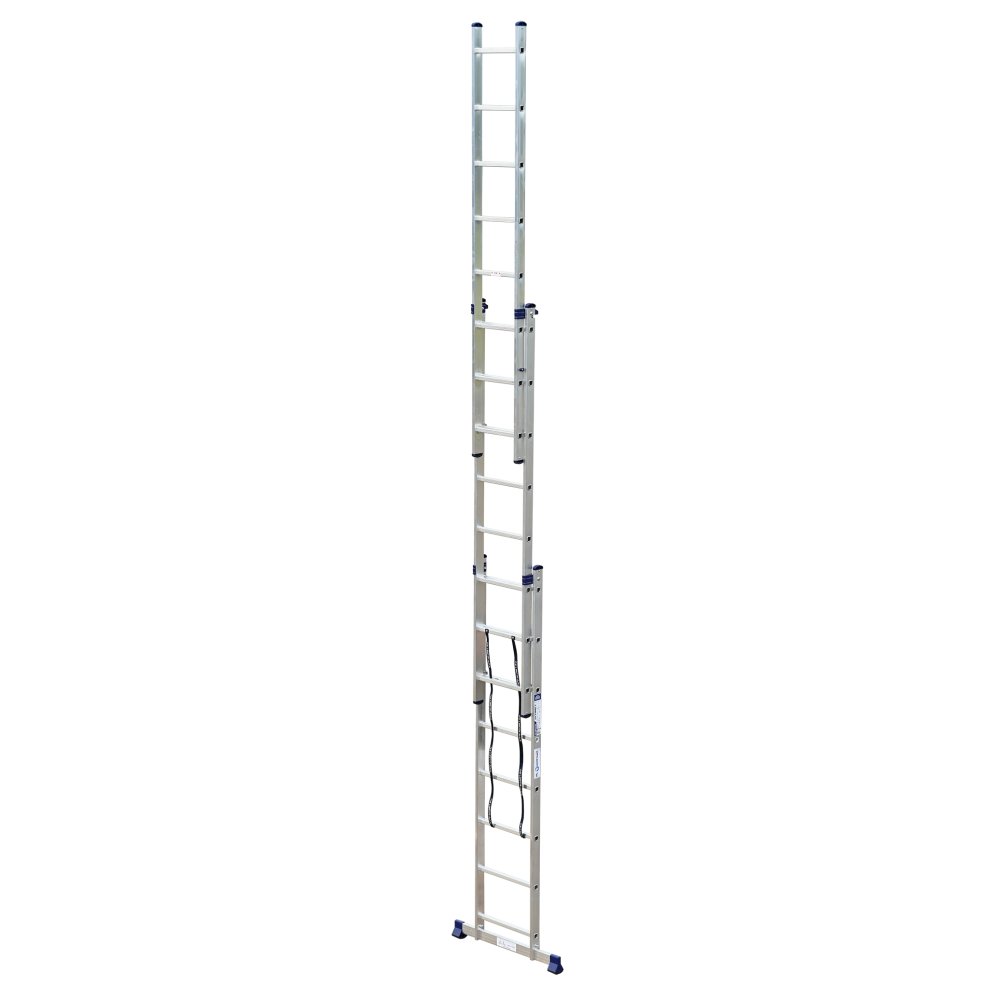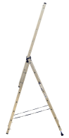 Универсальность данной лестницы заключается в том, что она может использоваться как раздвижная приставная лестница из трех частей и как свободностоящая стремянка (перевернутая русская буква «У»). Более того третья секция является съемной, и ею можно пользоваться отдельно как приставной лестницей, а оставшаяся часть при этом представляет двухсекционную универсальную лестницу. Эта лестница является по праву наиболее универсальной из всех лестниц, и несмотря на необходимый попарный перехлест секций как в конфигурации «приставная лестница» так и в конфигурации «стремянка», что усложняет, утяжеляет и поэтому удорожает ее, является самой популярной по продаваемости из-за своей исключительной универсальности.