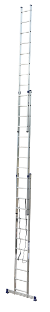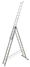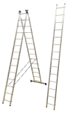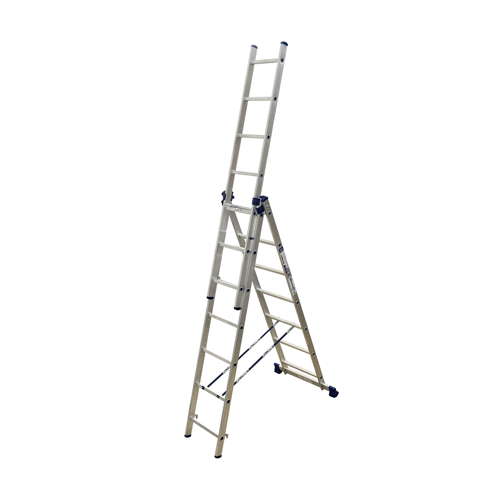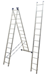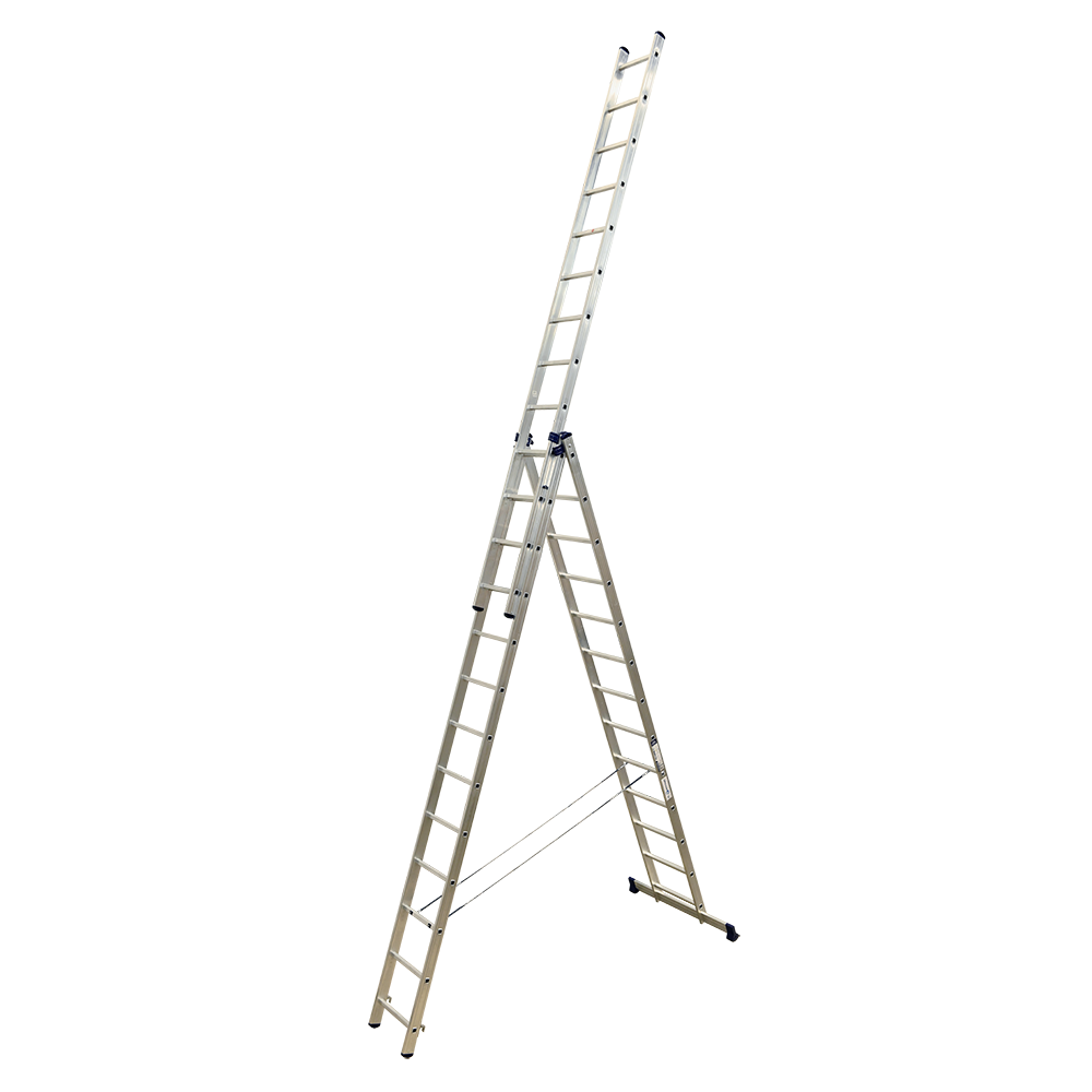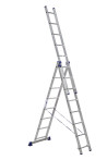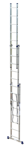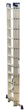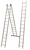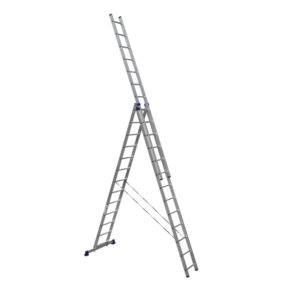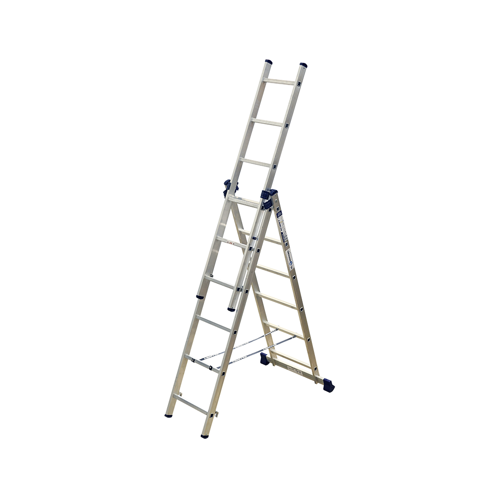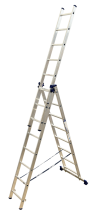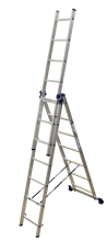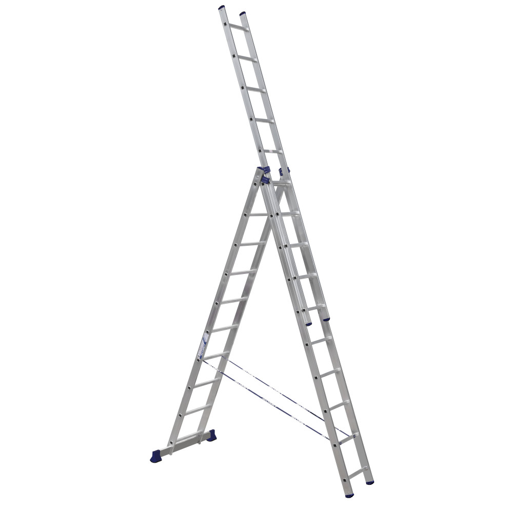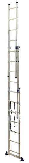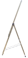 Универсальность данной лестницы заключается в том, что она может использоваться как раздвижная приставная лестница из трех частей и как свободностоящая стремянка (перевернутая русская буква «У»). Более того третья секция является съемной, и ею можно пользоваться отдельно как приставной лестницей, а оставшаяся часть при этом представляет двухсекционную универсальную лестницу. Эта лестница является по праву наиболее универсальной из всех лестниц, и несмотря на необходимый попарный перехлест секций как в конфигурации «приставная лестница» так и в конфигурации «стремянка», что усложняет, утяжеляет и поэтому удорожает ее, является самой популярной по продаваемости из-за своей исключительной универсальности.