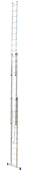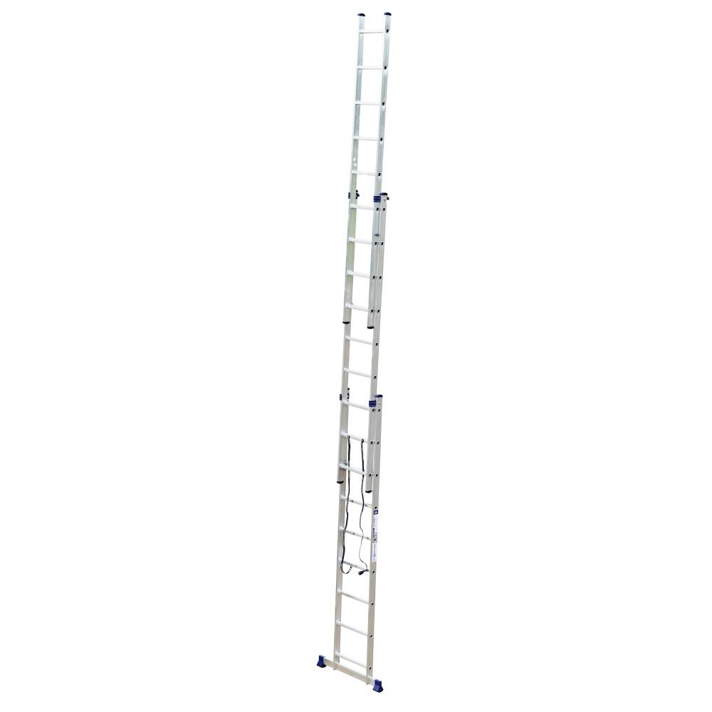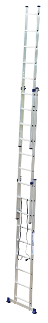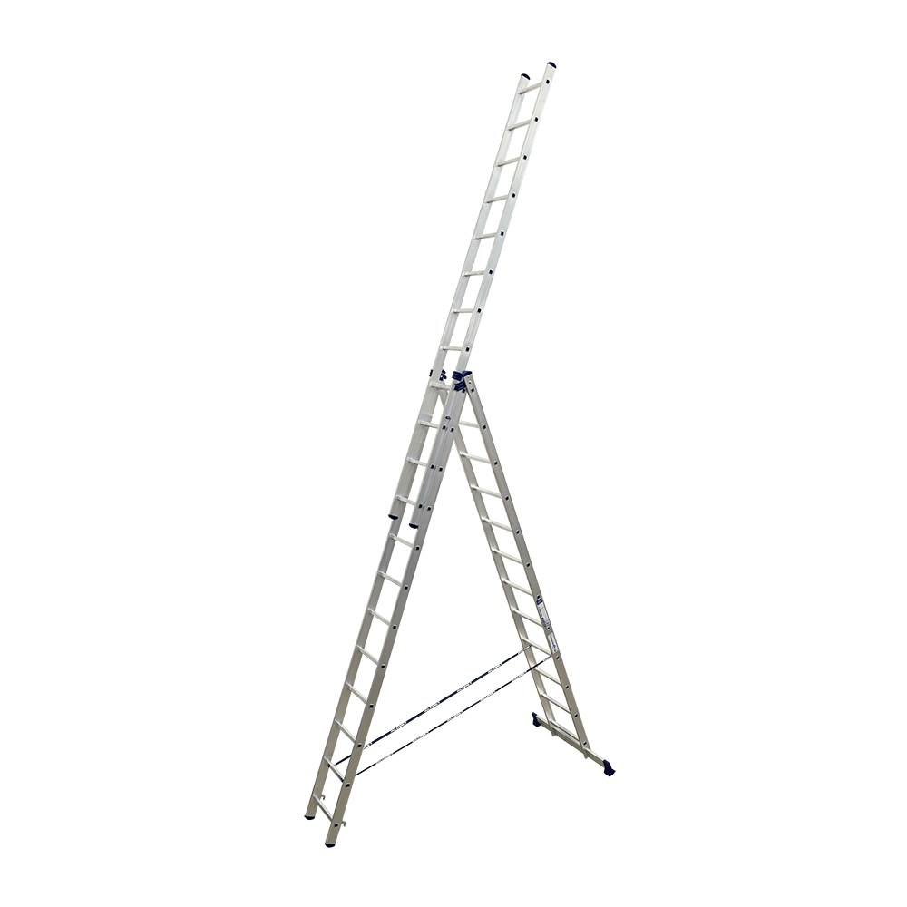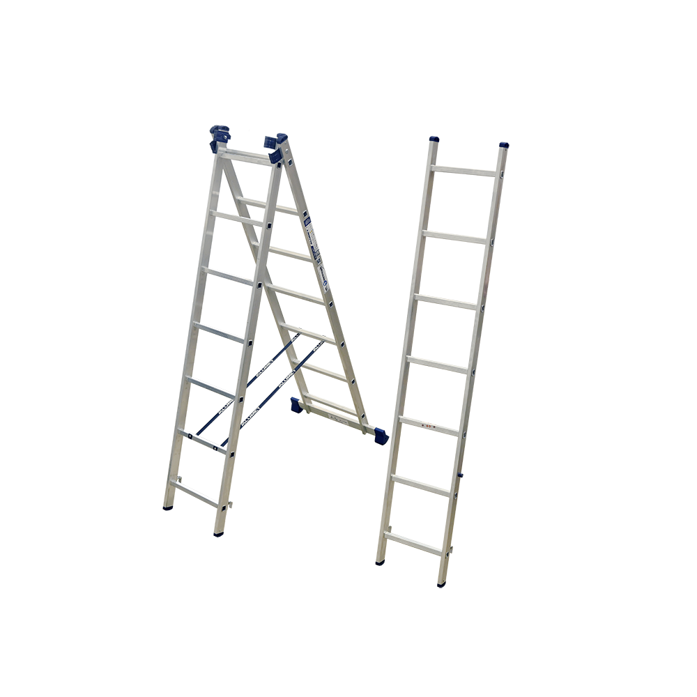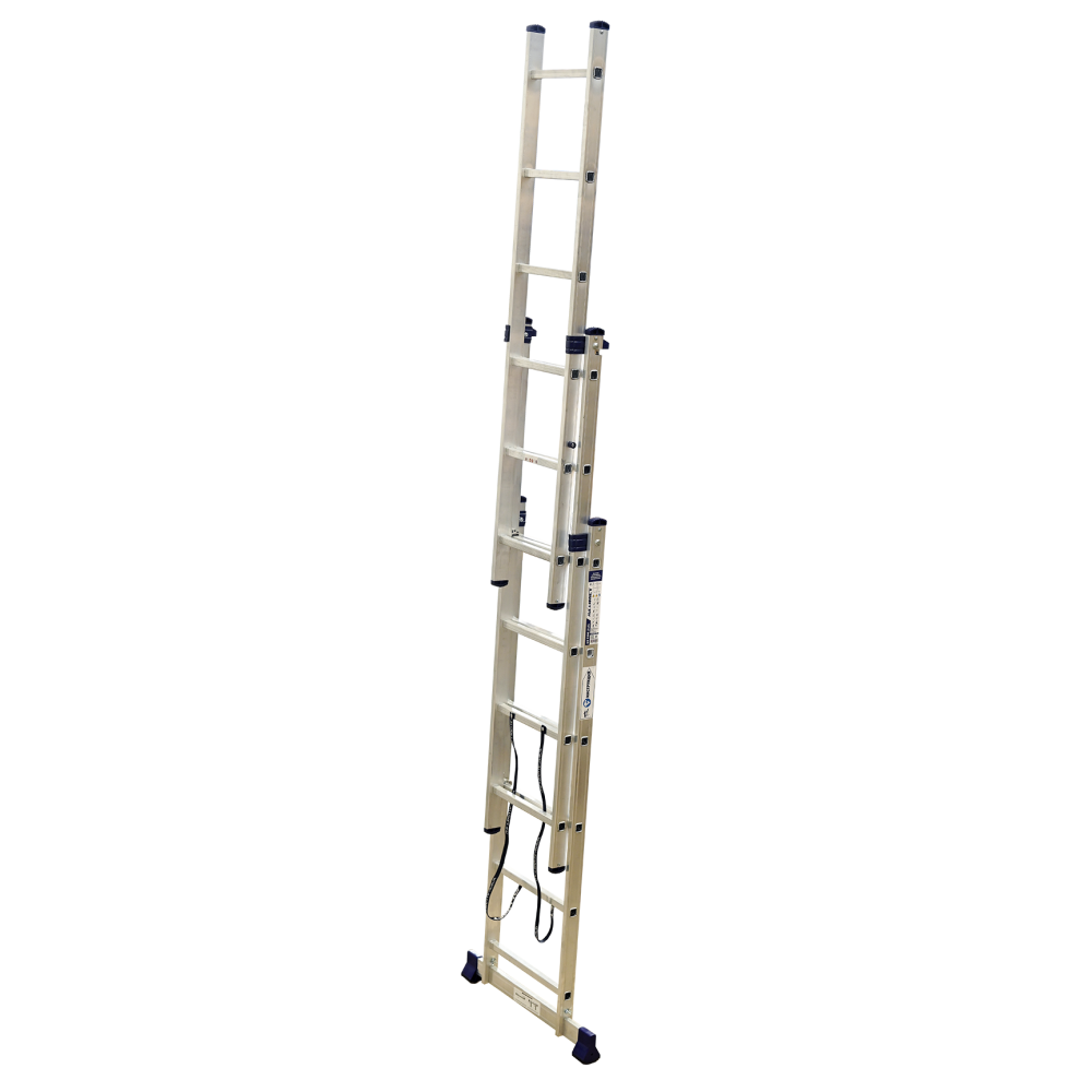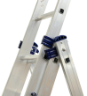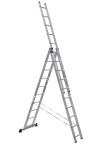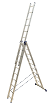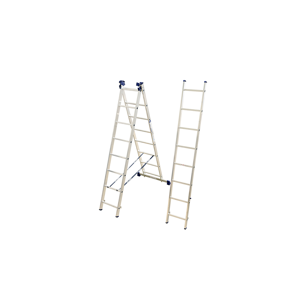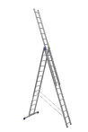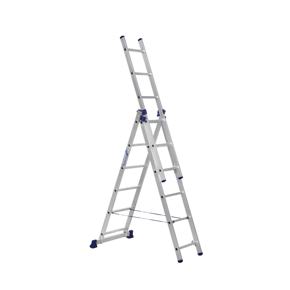 Универсальность данной лестницы заключается в том, что она может использоваться как раздвижная приставная лестница из трех частей и как свободностоящая стремянка (перевернутая русская буква «У»). Более того третья секция является съемной, и ею можно пользоваться отдельно как приставной лестницей, а оставшаяся часть при этом представляет двухсекционную универсальную лестницу. Эта лестница является по праву наиболее универсальной из всех лестниц, и несмотря на необходимый попарный перехлест секций как в конфигурации «приставная лестница» так и в конфигурации «стремянка», что усложняет, утяжеляет и поэтому удорожает ее, является самой популярной по продаваемости из-за своей исключительной универсальности.
