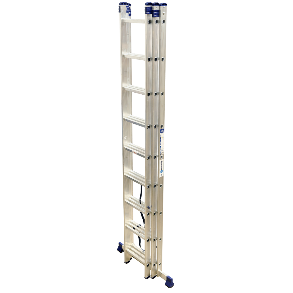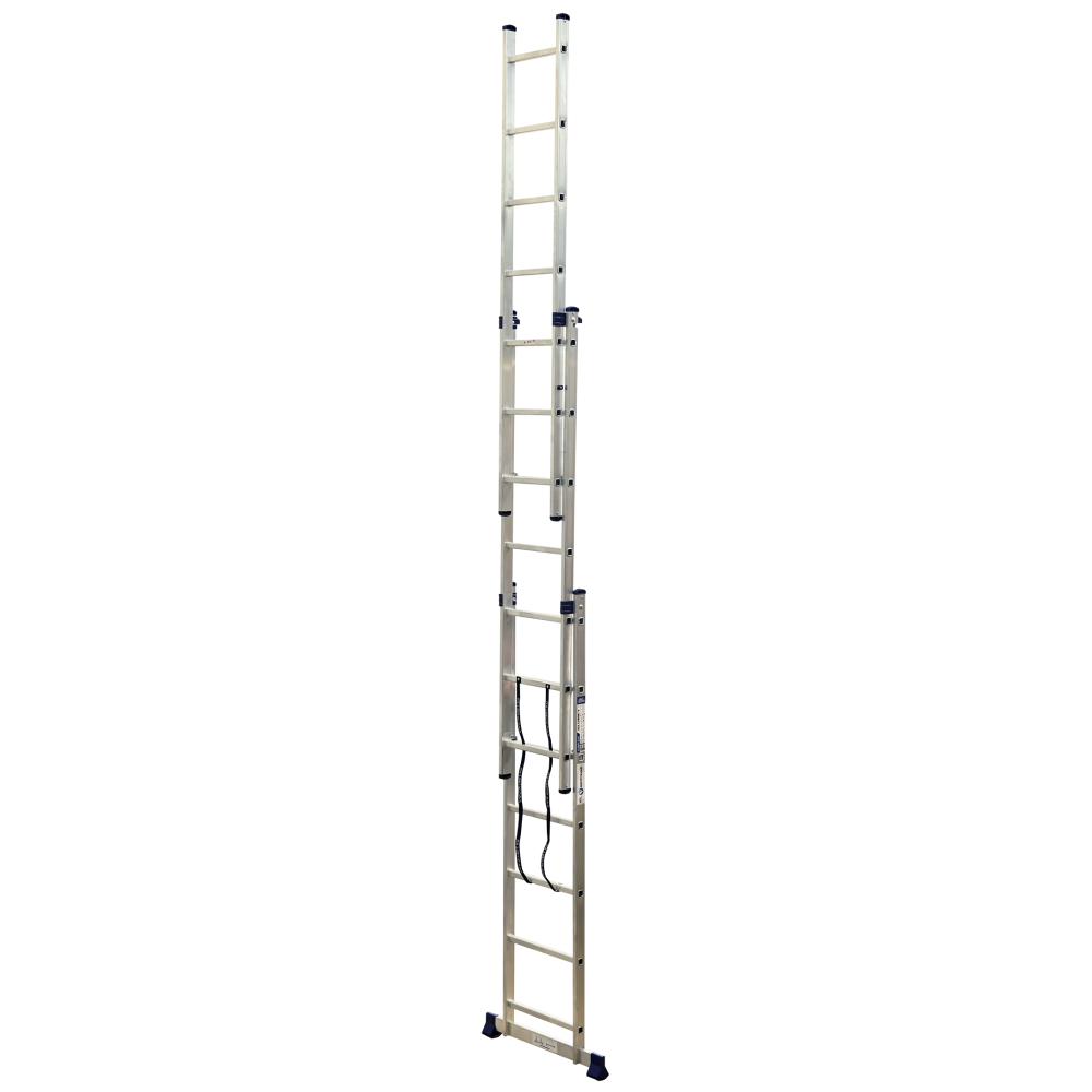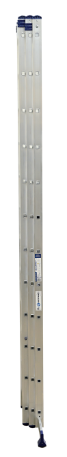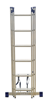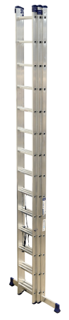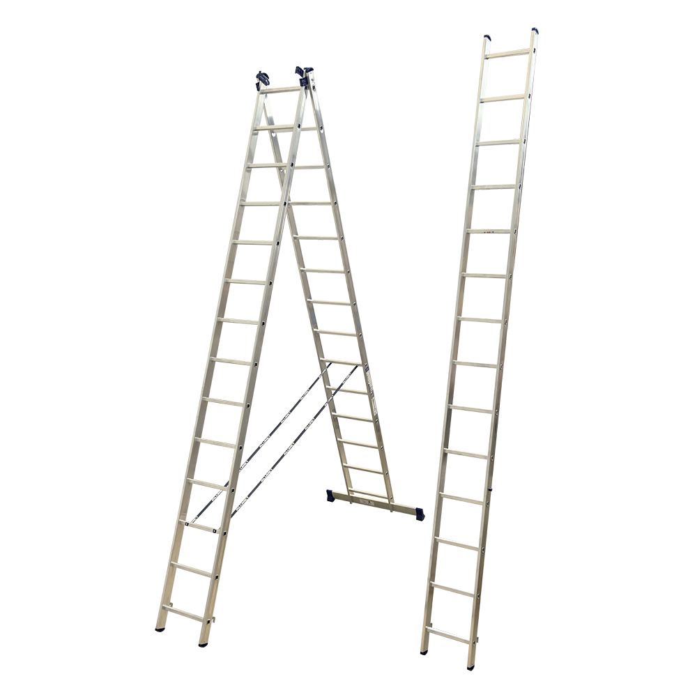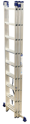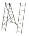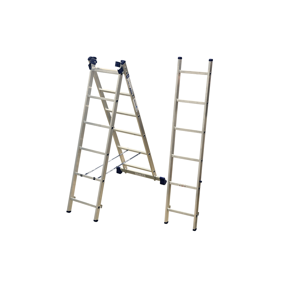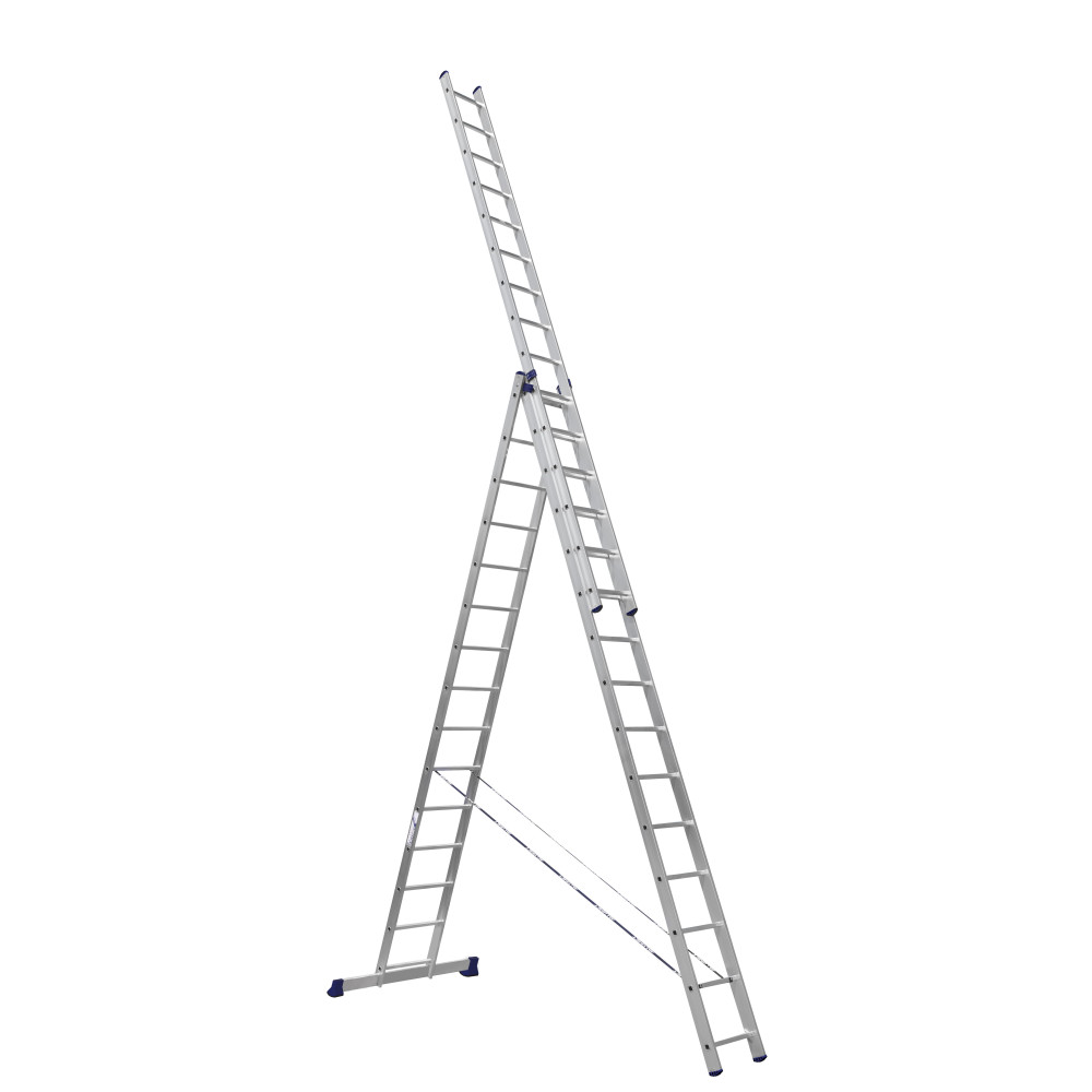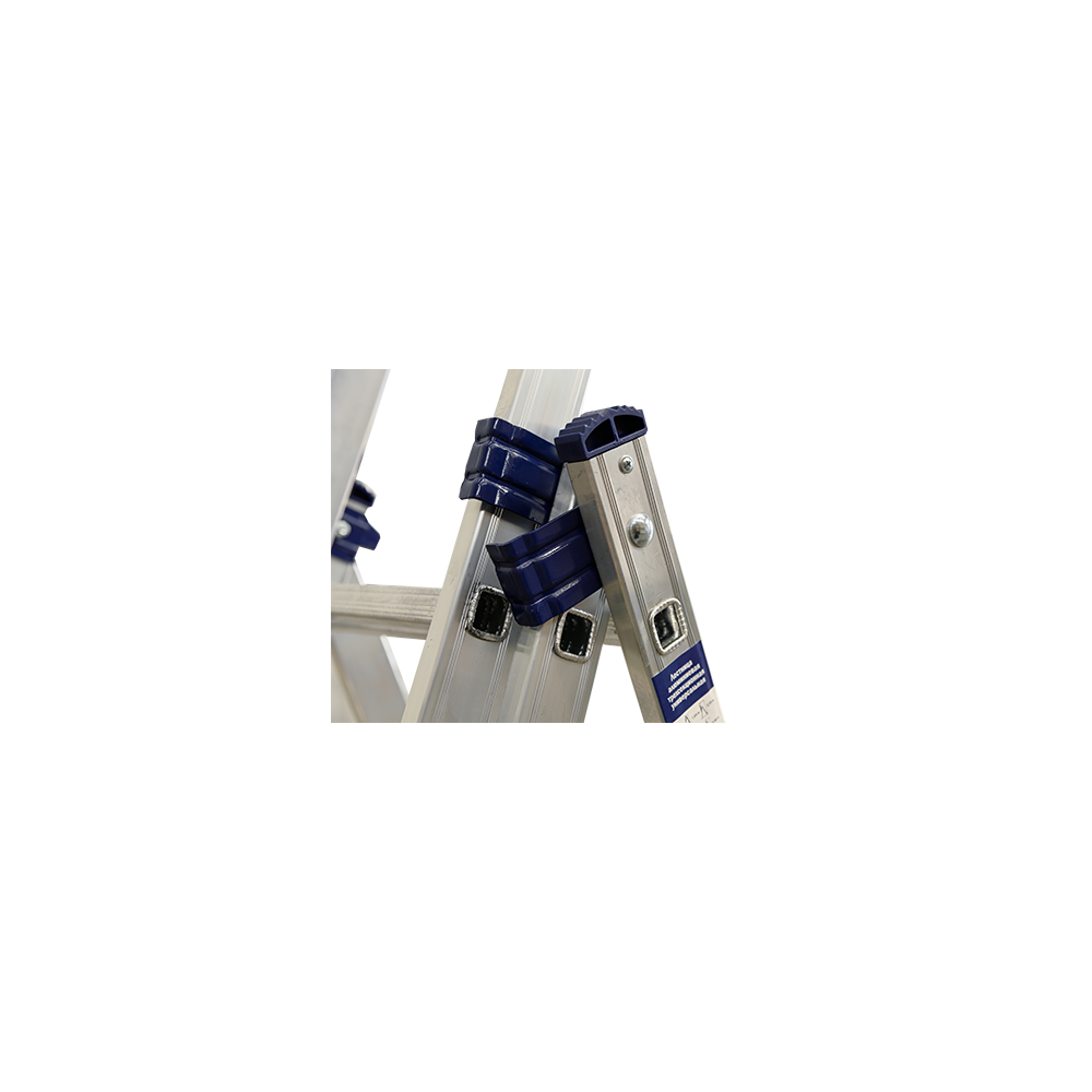 Универсальность данной лестницы заключается в том, что она может использоваться как раздвижная приставная лестница из трех частей и как свободностоящая стремянка (перевернутая русская буква «У»). Более того третья секция является съемной, и ею можно пользоваться отдельно как приставной лестницей, а оставшаяся часть при этом представляет двухсекционную универсальную лестницу. Эта лестница является по праву наиболее универсальной из всех лестниц, и несмотря на необходимый попарный перехлест секций как в конфигурации «приставная лестница» так и в конфигурации «стремянка», что усложняет, утяжеляет и поэтому удорожает ее, является самой популярной по продаваемости из-за своей исключительной универсальности.
