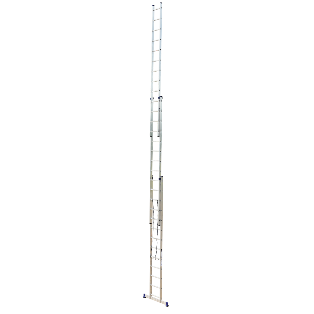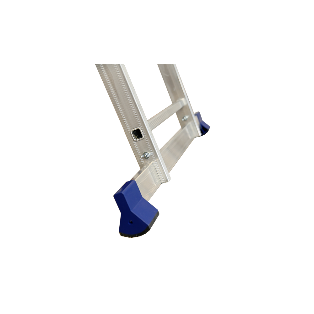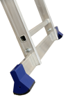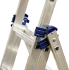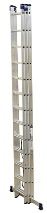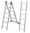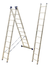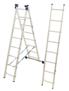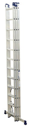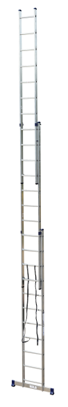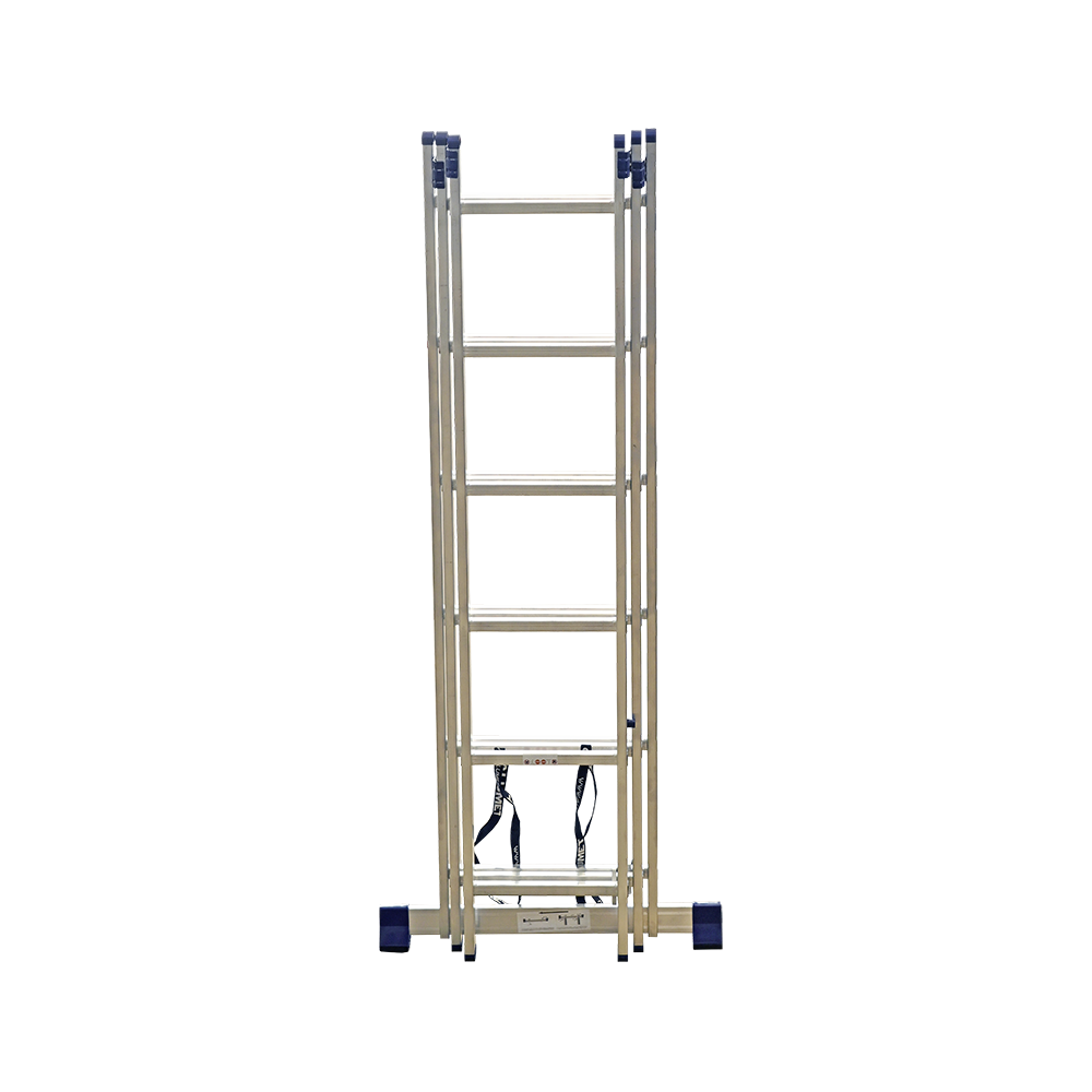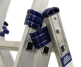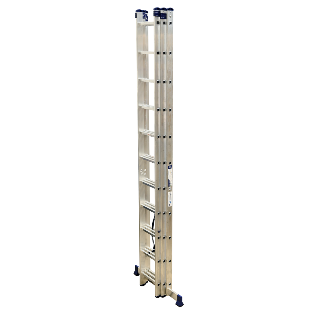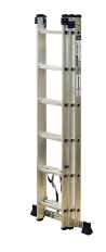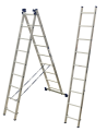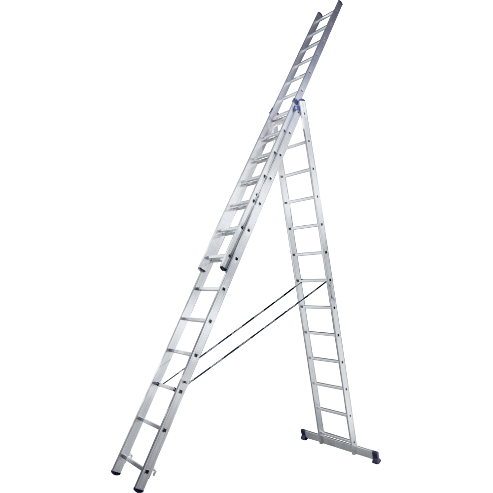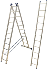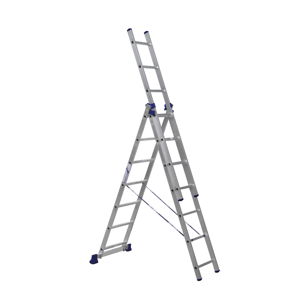 Универсальность данной лестницы заключается в том, что она может использоваться как раздвижная приставная лестница из трех частей и как свободностоящая стремянка (перевернутая русская буква «У»). Более того третья секция является съемной, и ею можно пользоваться отдельно как приставной лестницей, а оставшаяся часть при этом представляет двухсекционную универсальную лестницу. Эта лестница является по праву наиболее универсальной из всех лестниц, и несмотря на необходимый попарный перехлест секций как в конфигурации «приставная лестница» так и в конфигурации «стремянка», что усложняет, утяжеляет и поэтому удорожает ее, является самой популярной по продаваемости из-за своей исключительной универсальности.