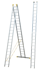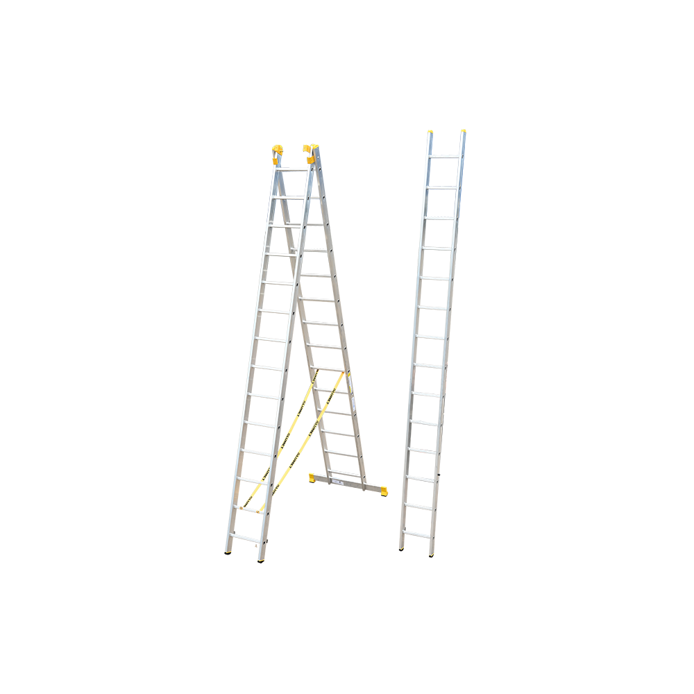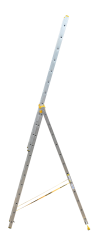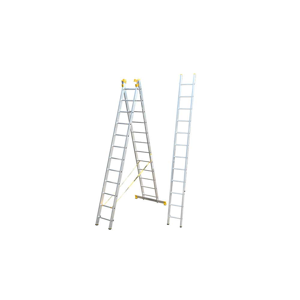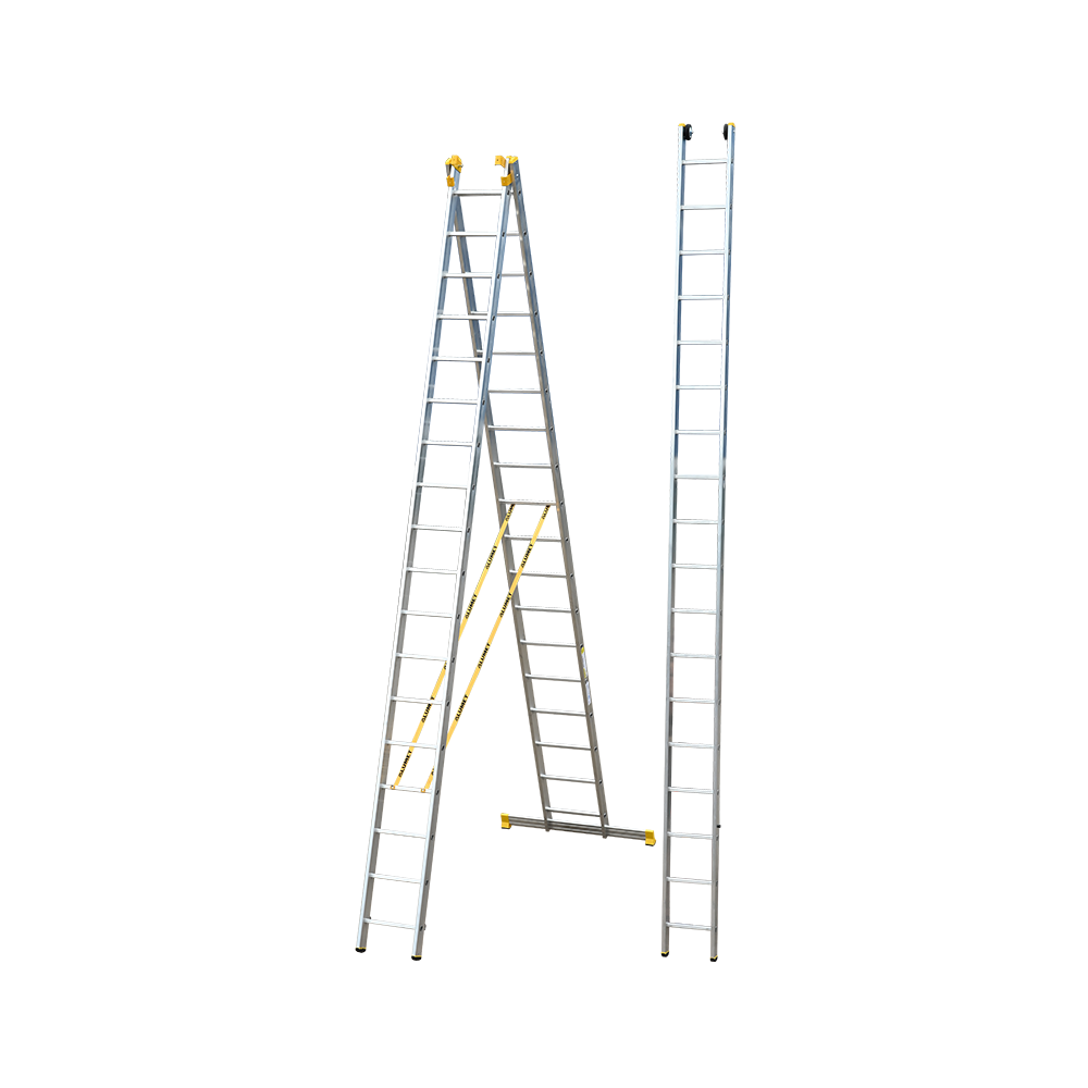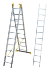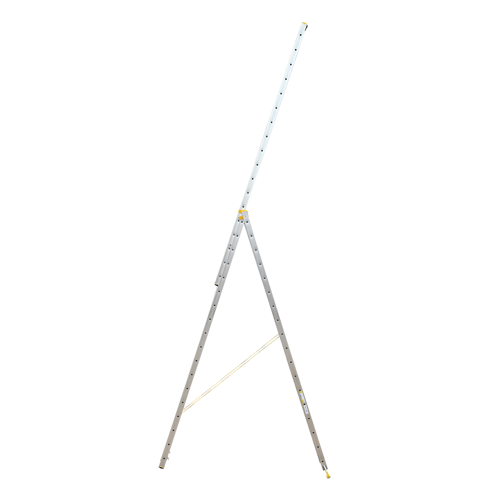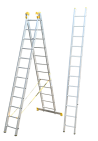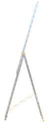 Универсальность данной лестницы заключается в том, что она может использоваться как раздвижная приставная лестница из трех частей и как свободностоящая стремянка (перевернутая русская буква «У»). Более того третья секция является съемной, и ею можно пользоваться отдельно как приставной лестницей, а оставшаяся часть при этом представляет двухсекционную универсальную лестницу. Эта лестница является по праву наиболее универсальной из всех лестниц, и несмотря на необходимый попарный перехлест секций как в положении «приставная лестница» так и в положении «стремянка», что усложняет, утяжеляет и поэтому удорожает ее, является самой популярной по продаваемости из-за своей исключительной универсальности.