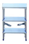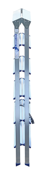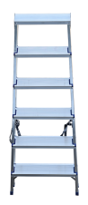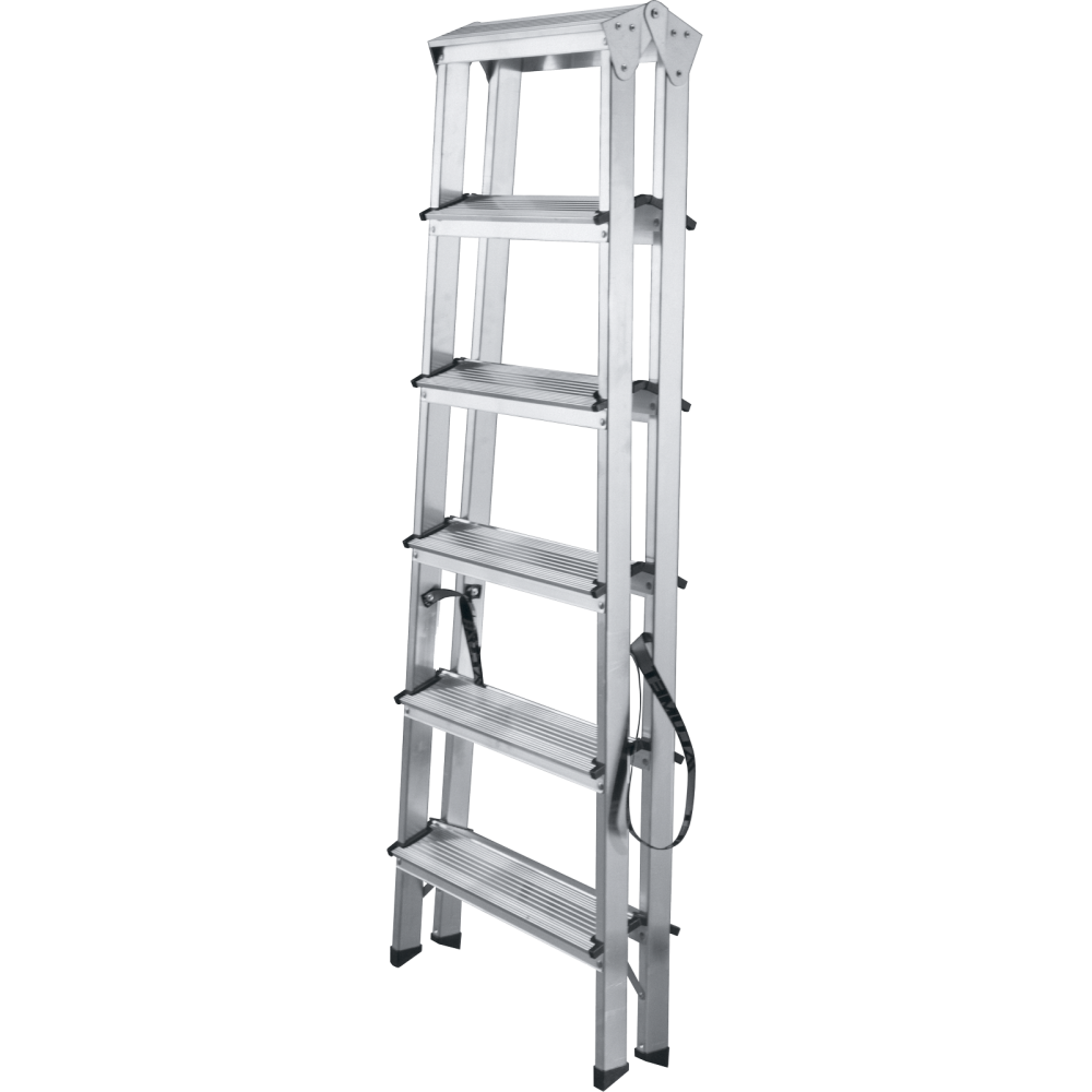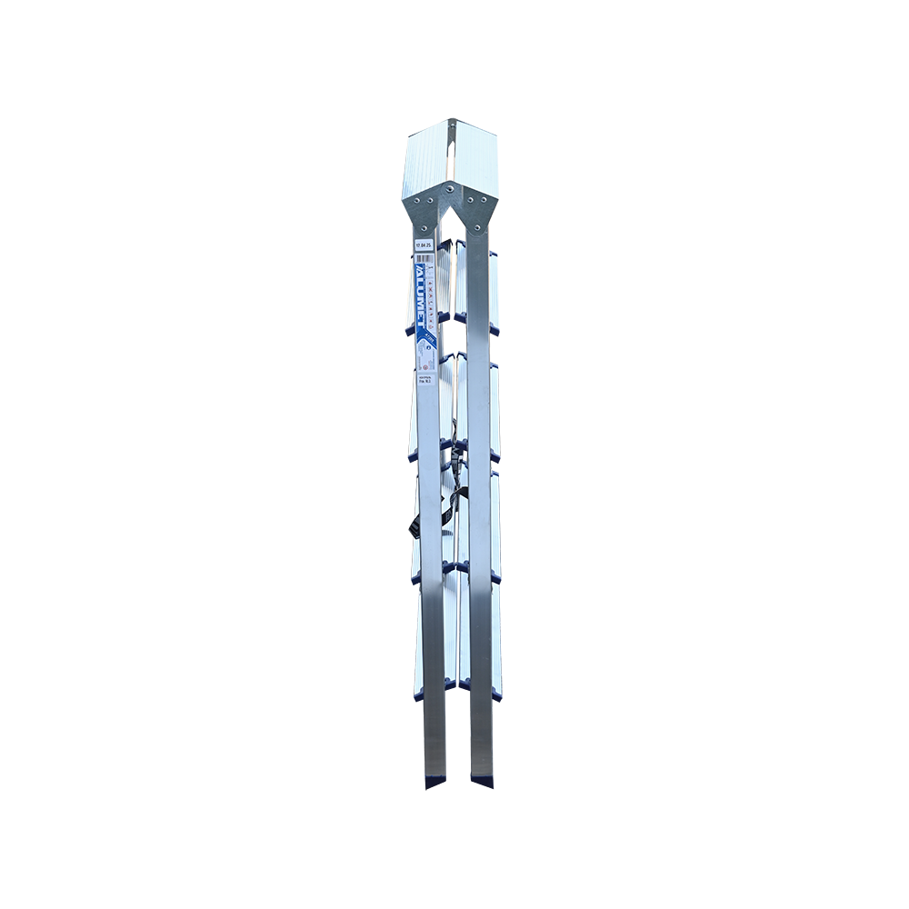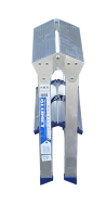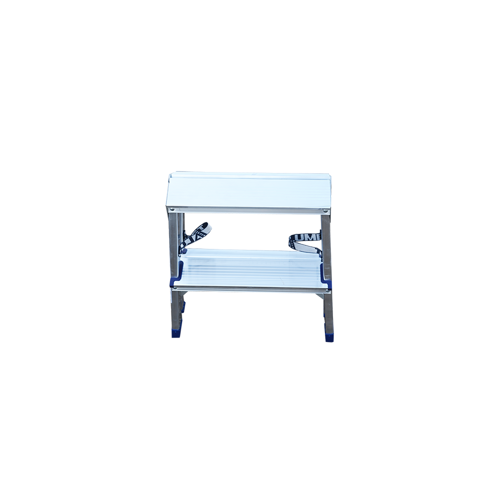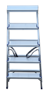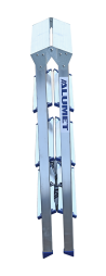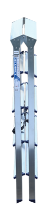 Стремянка фиксируется двумя страховочными ремнями. Тетивы и ступени выполнены из высокопрочного алюминиевого профиля. Ступени имеют противоскользящую рифленую поверхность.