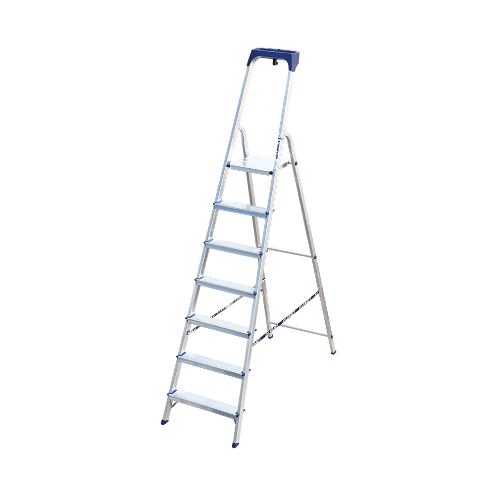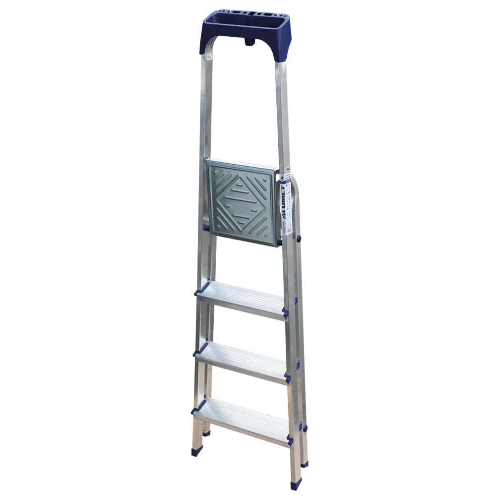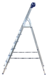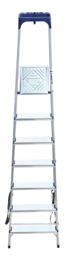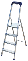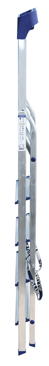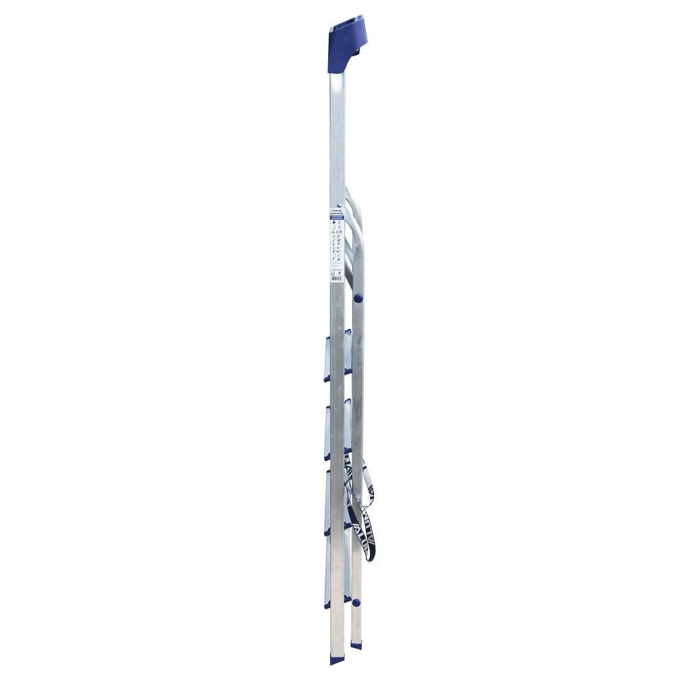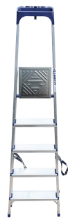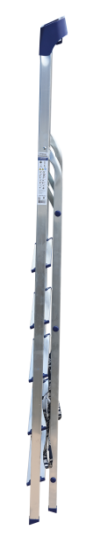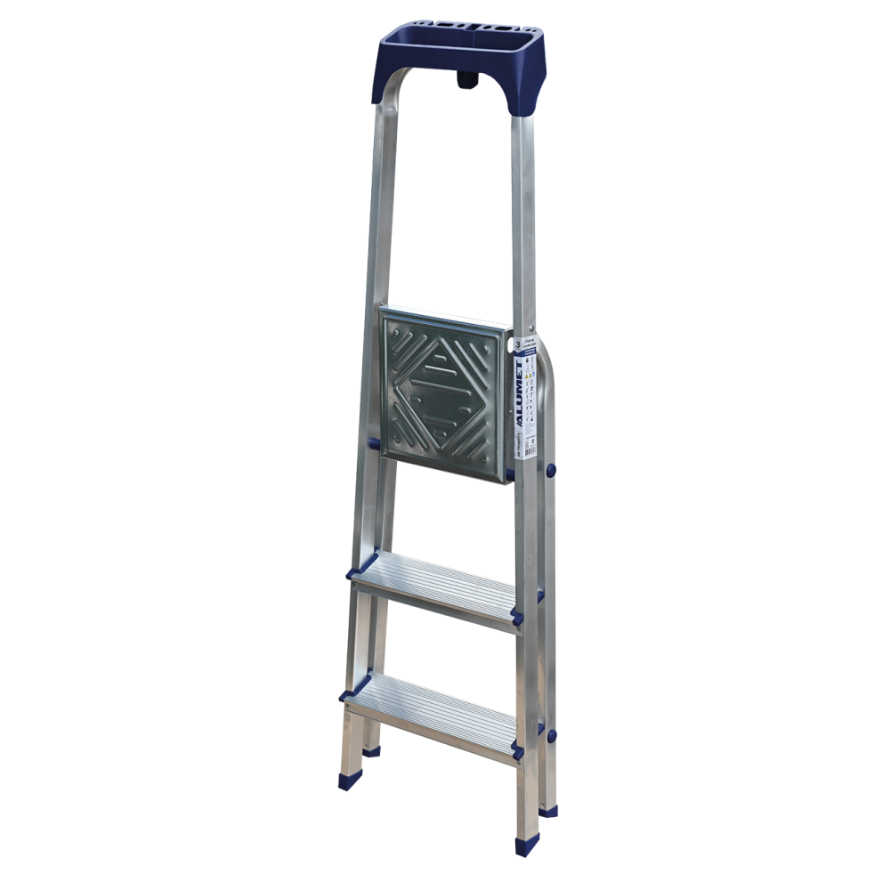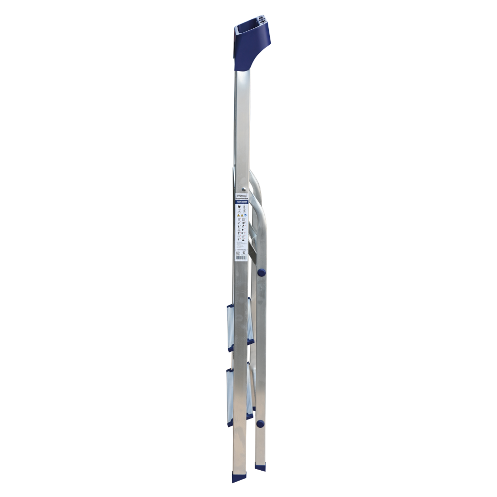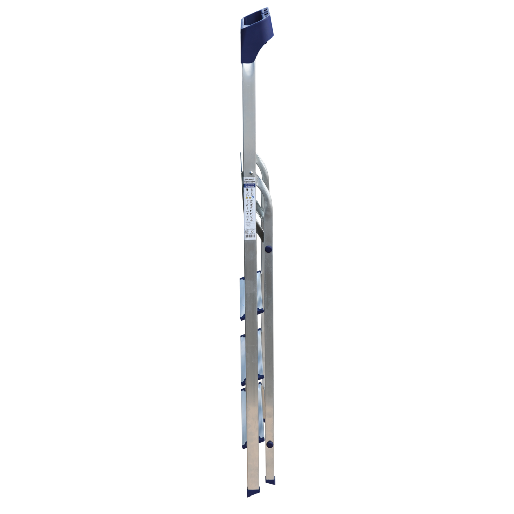 Стремянка алюминиевая изготовлена из высокопрочного алюминиевого профиля. Задняя и передняя нога соединены между собой. Рабочая площадка выполнена из оцинкованной стали. Ступени имеют рифленую поверхность. Башмаки изготовлены из высокопрочного пластика. Стремянка в рабочем положении надежно фиксируется рабочей площадкой, а начиная с пятиступенчатой и выше страховочными ремнями. Количество ступеней от 3-х до 10-и. Стремянка алюминиевая серии АМ 7xxAK011 предназначена для проведения различных видов работ на высоте до 4 м как в быту, так и на производстве.