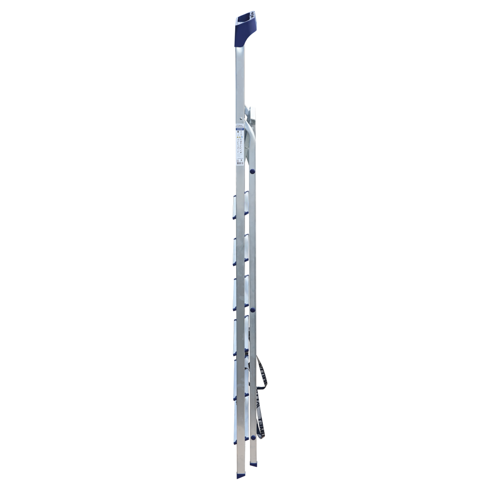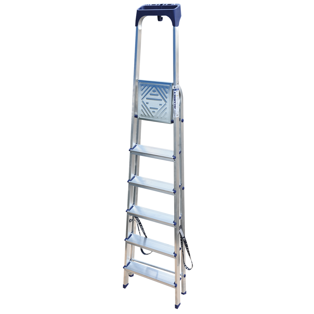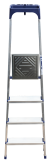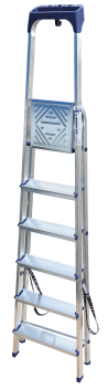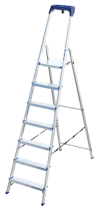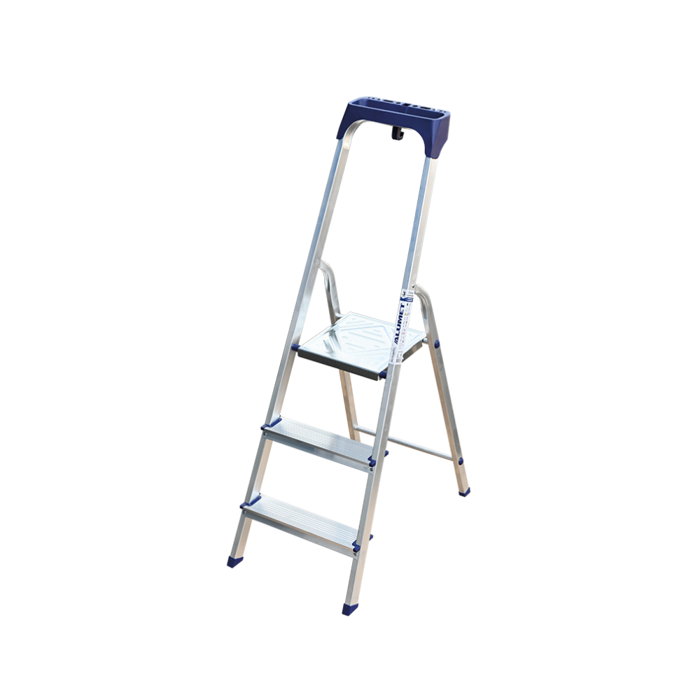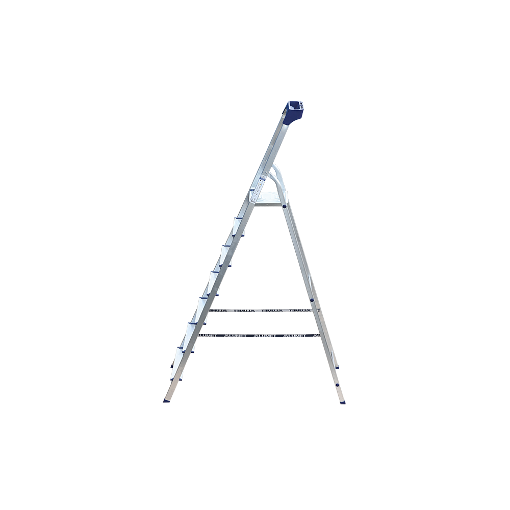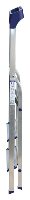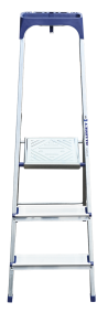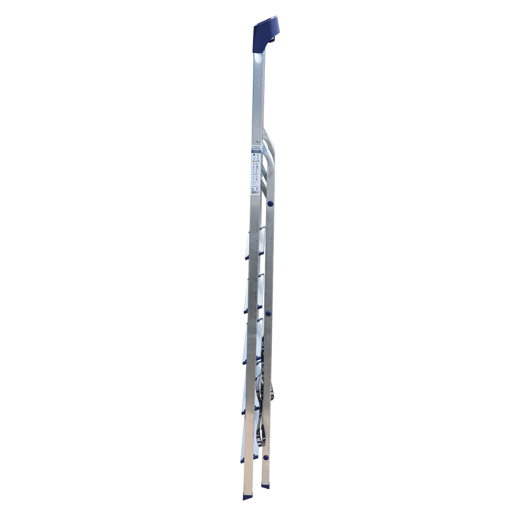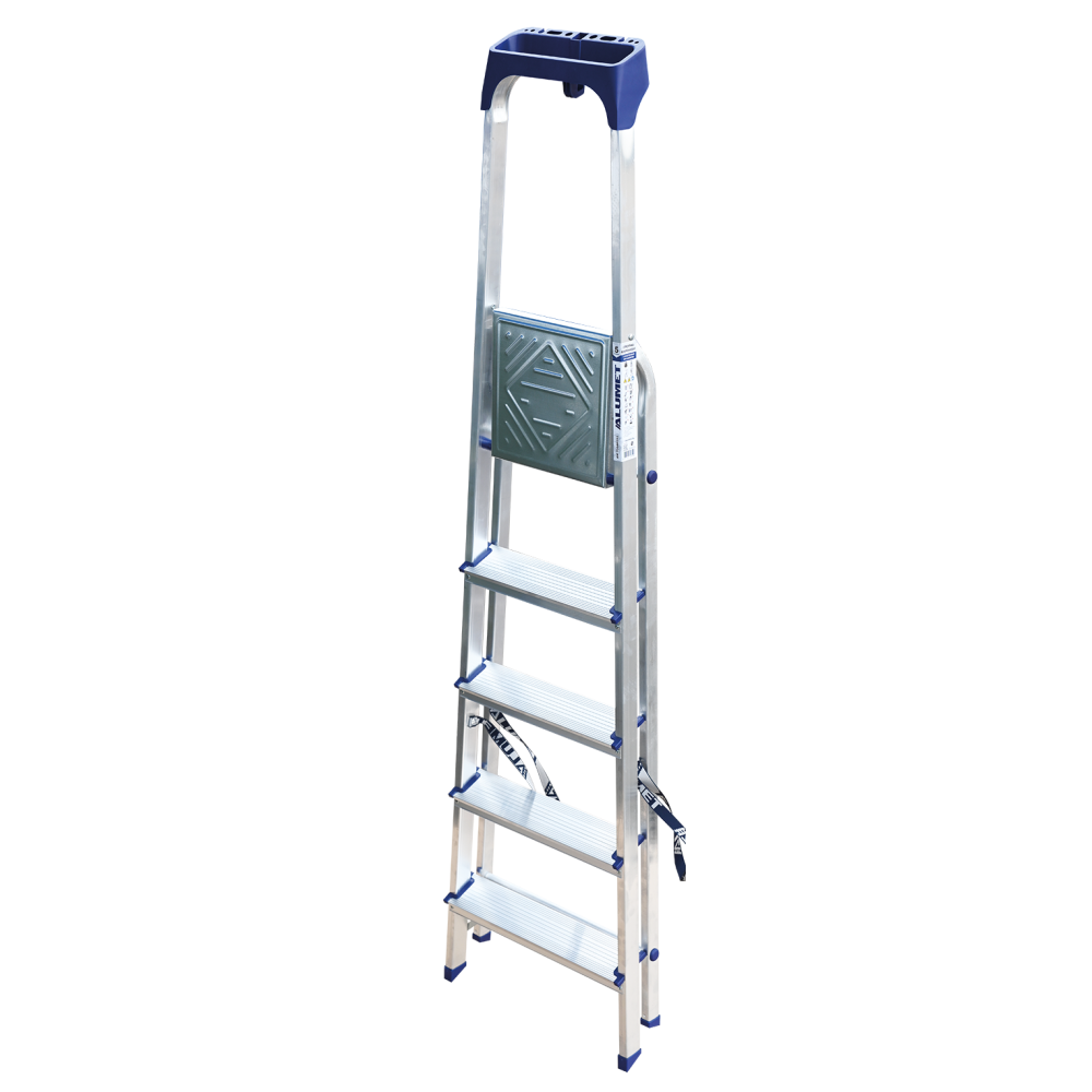 Стремянка алюминиевая изготовлена из высокопрочного алюминиевого профиля. Задняя и передняя нога соединены между собой. Рабочая площадка выполнена из оцинкованной стали. Ступени имеют рифленую поверхность. Башмаки изготовлены из высокопрочного пластика. Стремянка в рабочем положении надежно фиксируется рабочей площадкой, а начиная с пятиступенчатой и выше страховочными ремнями. Количество ступеней от 3-х до 10-и. Стремянка алюминиевая серии АМ 7xxAK011 предназначена для проведения различных видов работ на высоте до 4 м как в быту, так и на производстве.