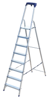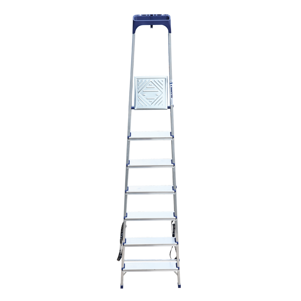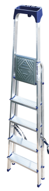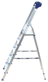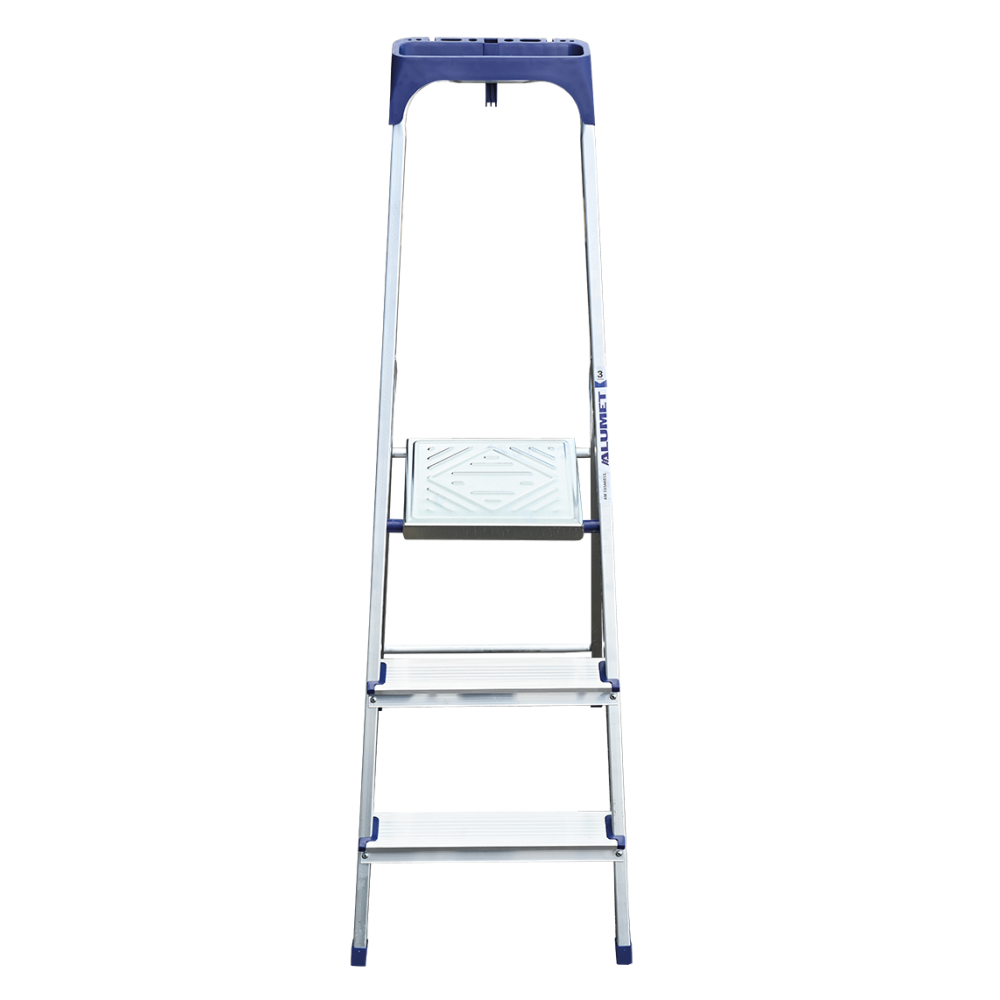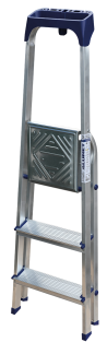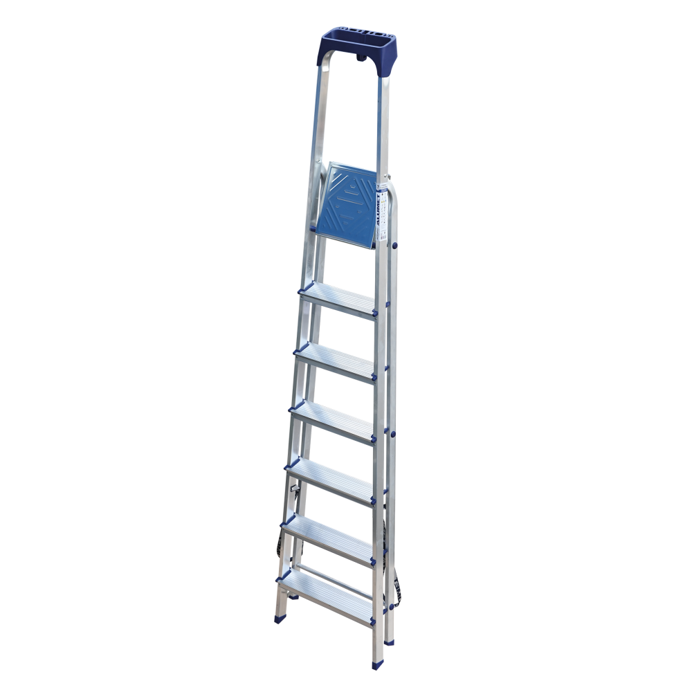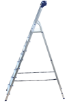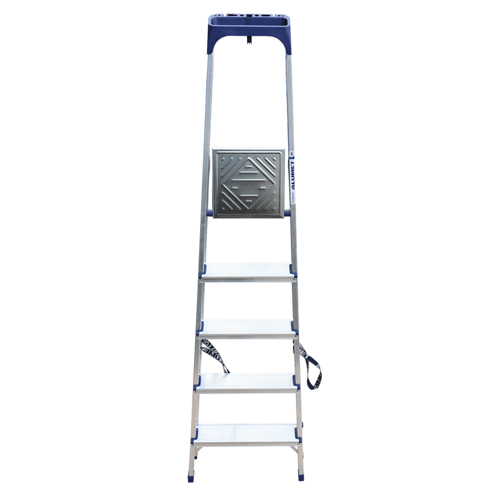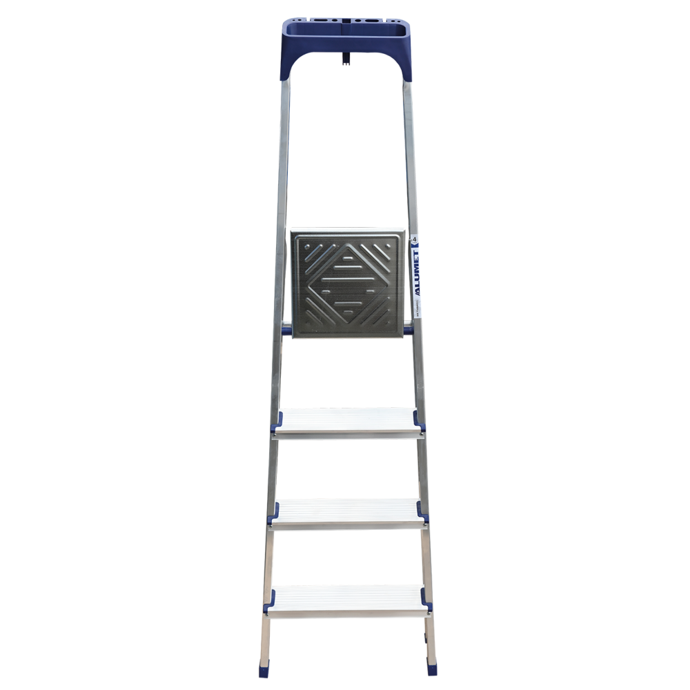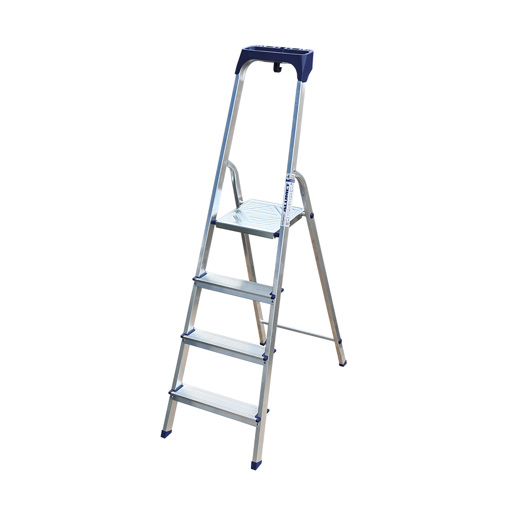 Стремянка алюминиевая изготовлена из высокопрочного алюминиевого профиля. Задняя и передняя нога соединены между собой. Рабочая площадка выполнена из оцинкованной стали. Ступени имеют рифленую поверхность. Башмаки изготовлены из высокопрочного пластика. Стремянка в рабочем положении надежно фиксируется рабочей площадкой, а начиная с пятиступенчатой и выше страховочными ремнями. Количество ступеней от 3-х до 10-и. Стремянка алюминиевая серии АМ 7xxAK011 предназначена для проведения различных видов работ на высоте до 4 м как в быту, так и на производстве.