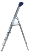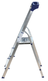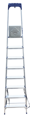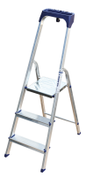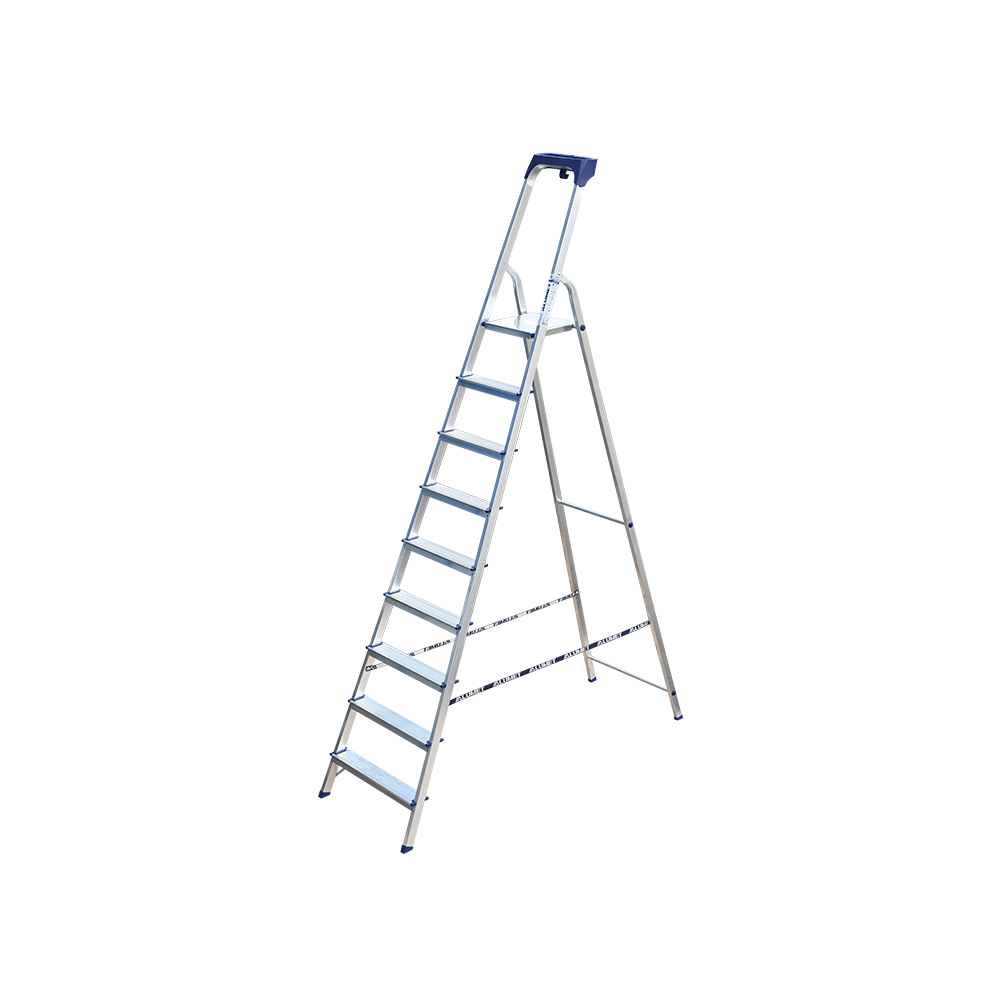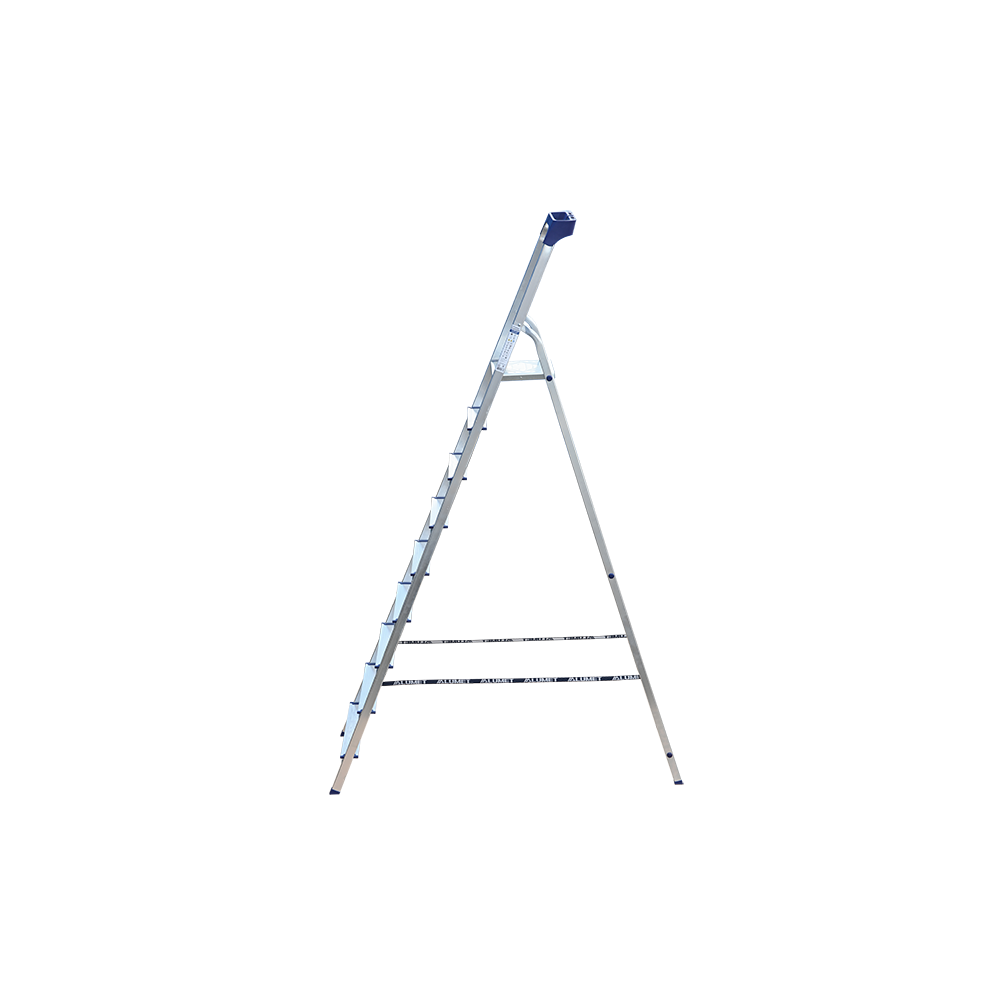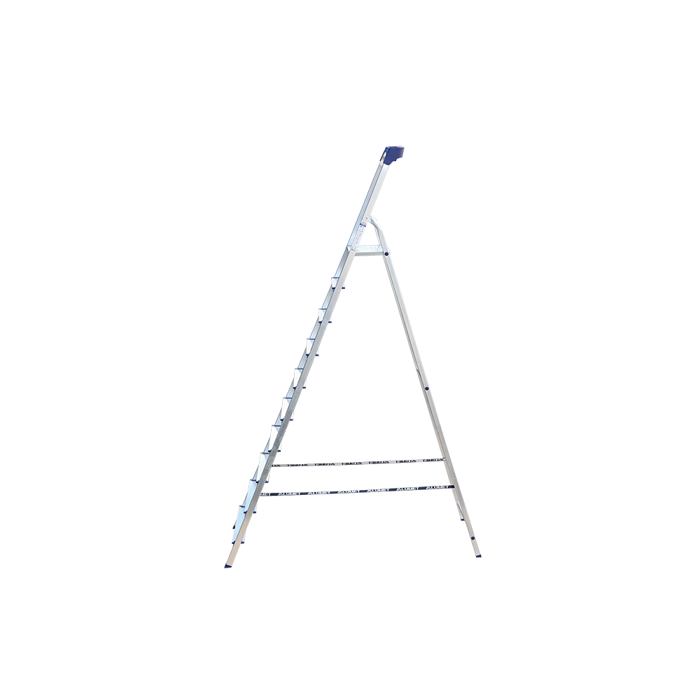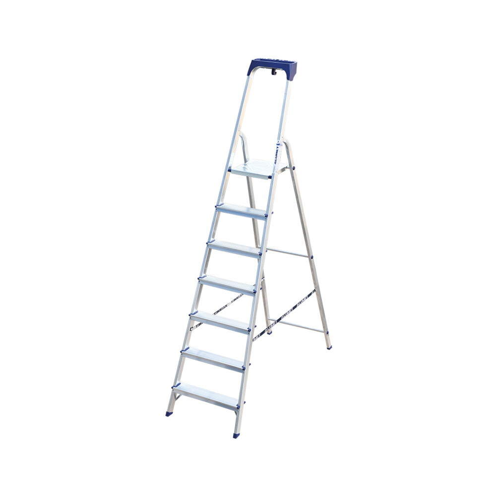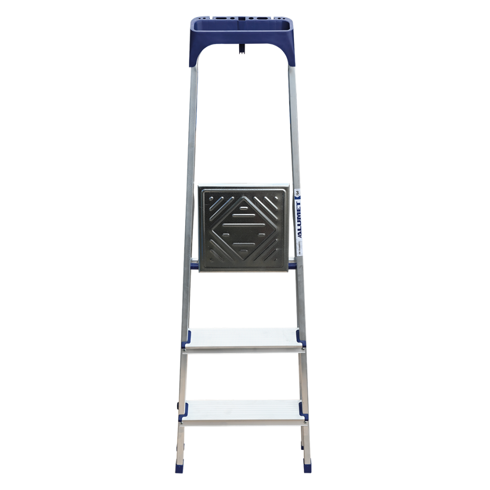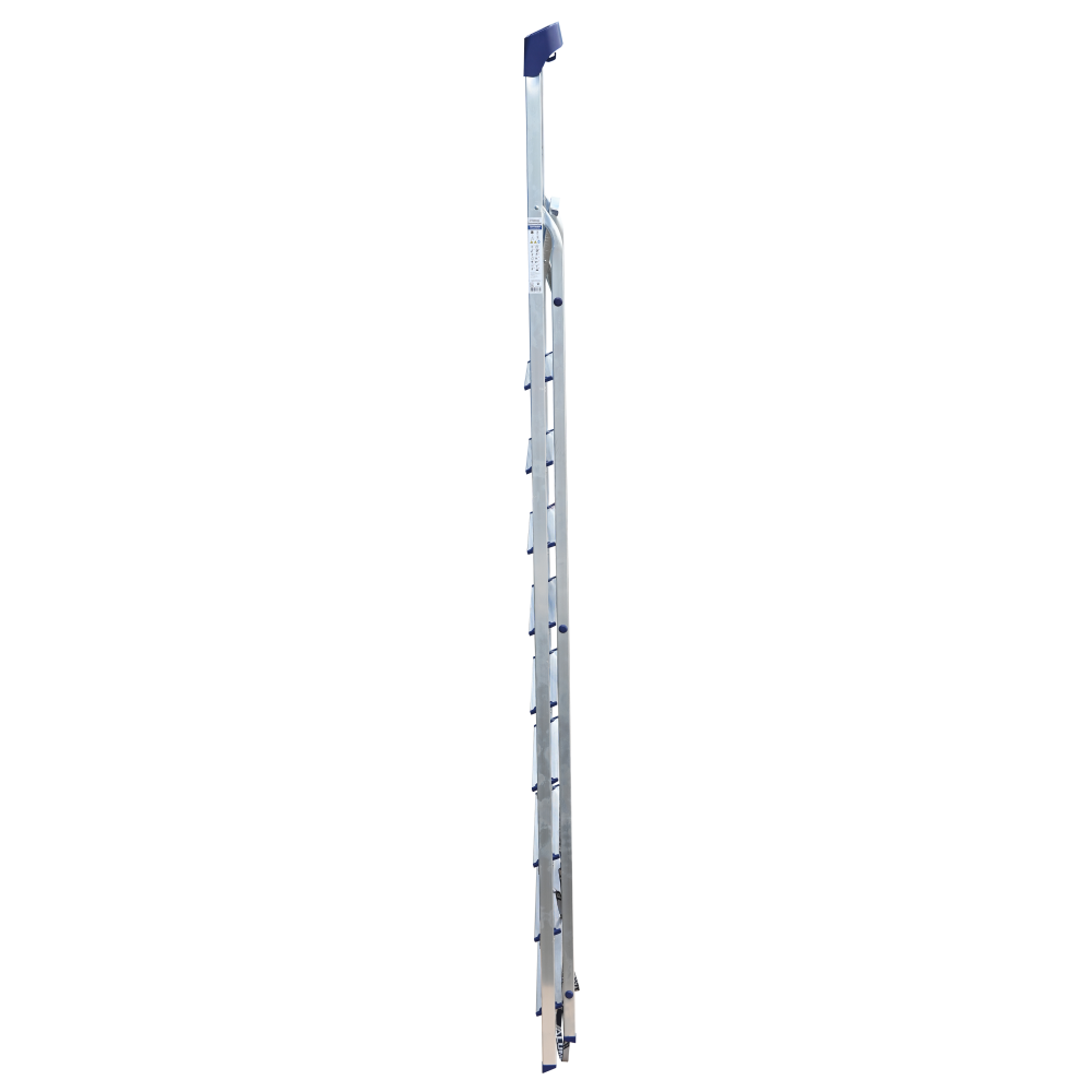 Стремянка алюминиевая изготовлена из высокопрочного алюминиевого профиля. Задняя и передняя нога соединены между собой. Рабочая площадка выполнена из оцинкованной стали. Ступени имеют рифленую поверхность. Башмаки изготовлены из высокопрочного пластика. Стремянка в рабочем положении надежно фиксируется рабочей площадкой, а начиная с пятиступенчатой и выше страховочными ремнями. Количество ступеней от 3-х до 10-и. Стремянка алюминиевая серии АМ 7xxAK011 предназначена для проведения различных видов работ на высоте до 4 м как в быту, так и на производстве.