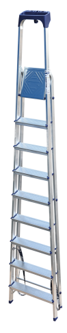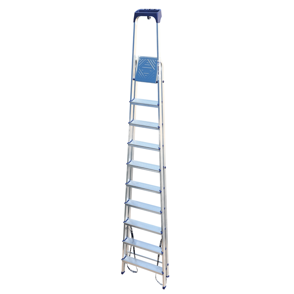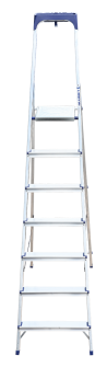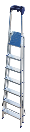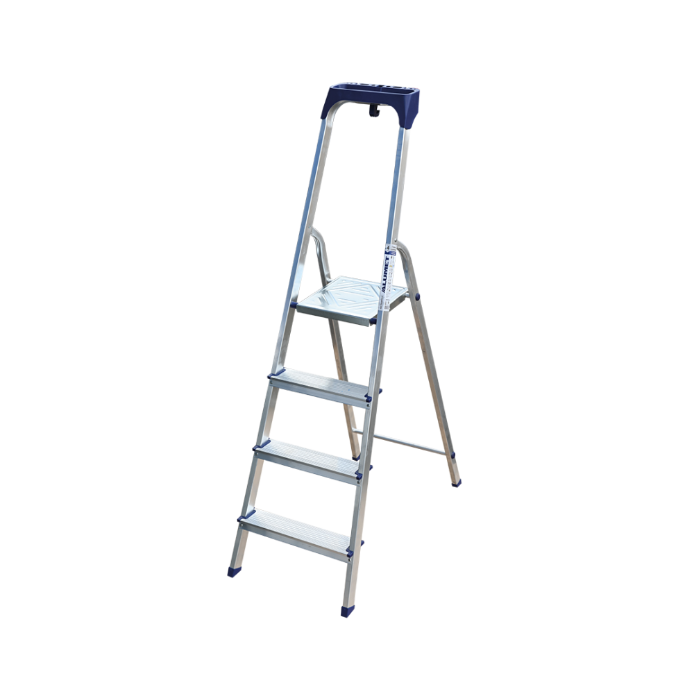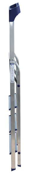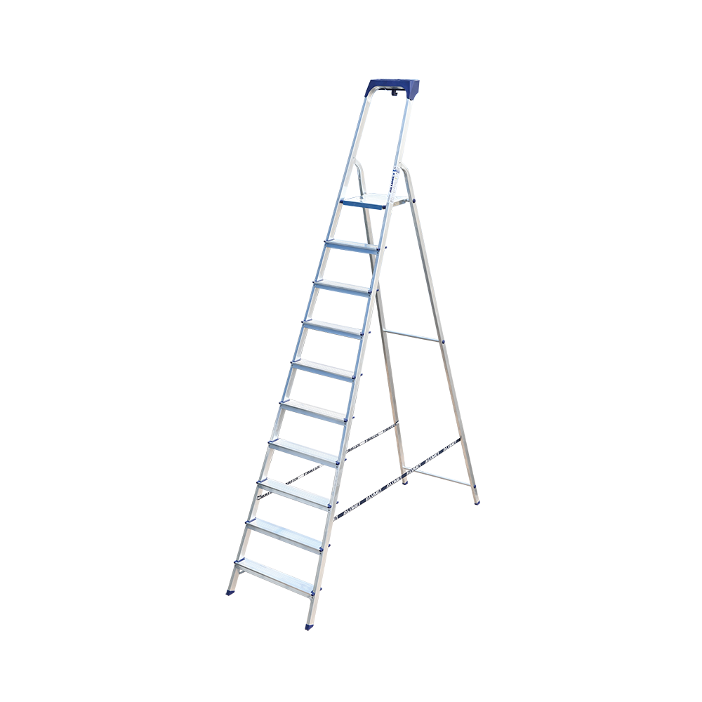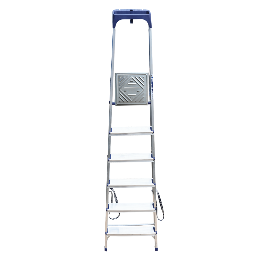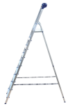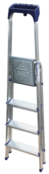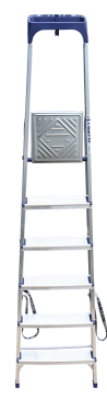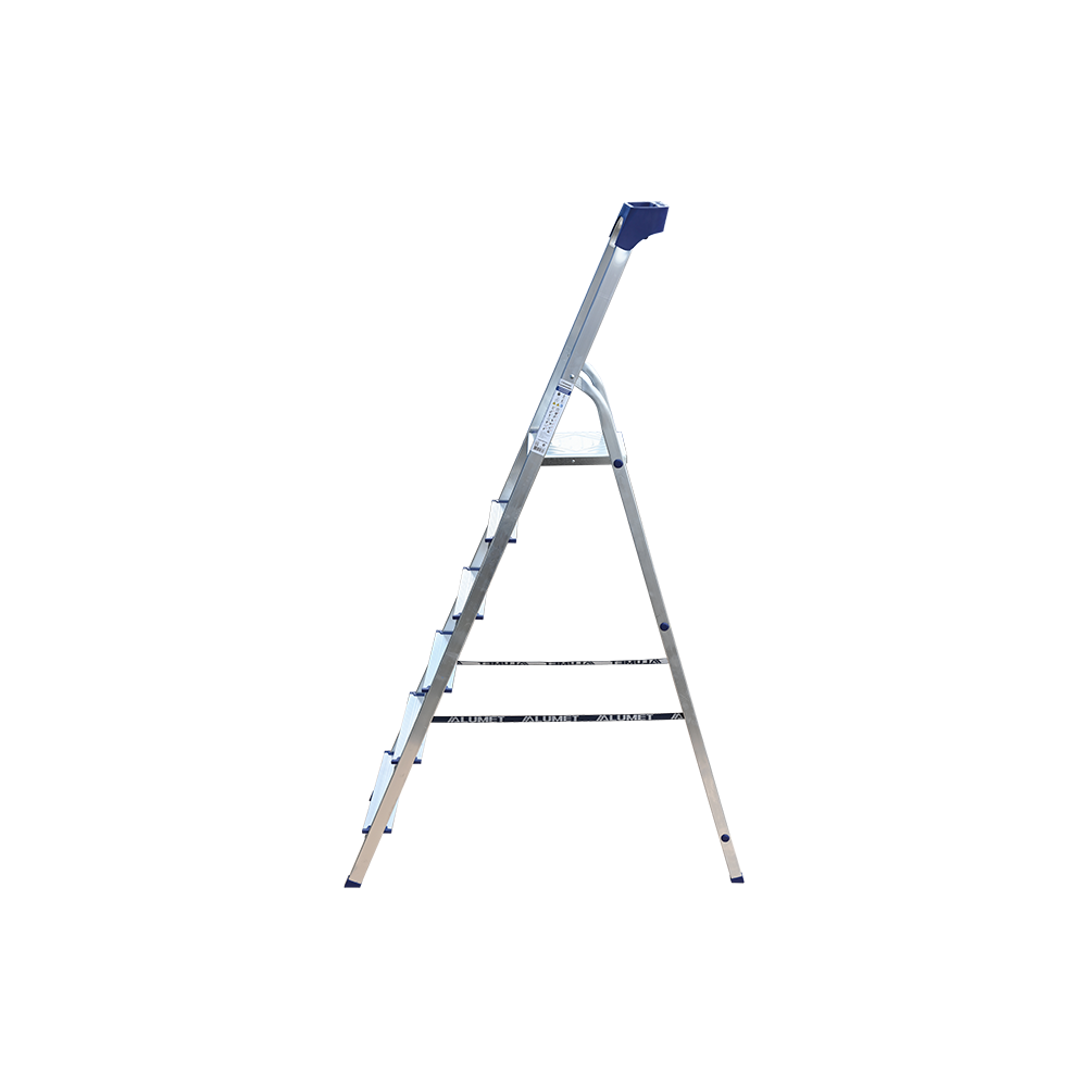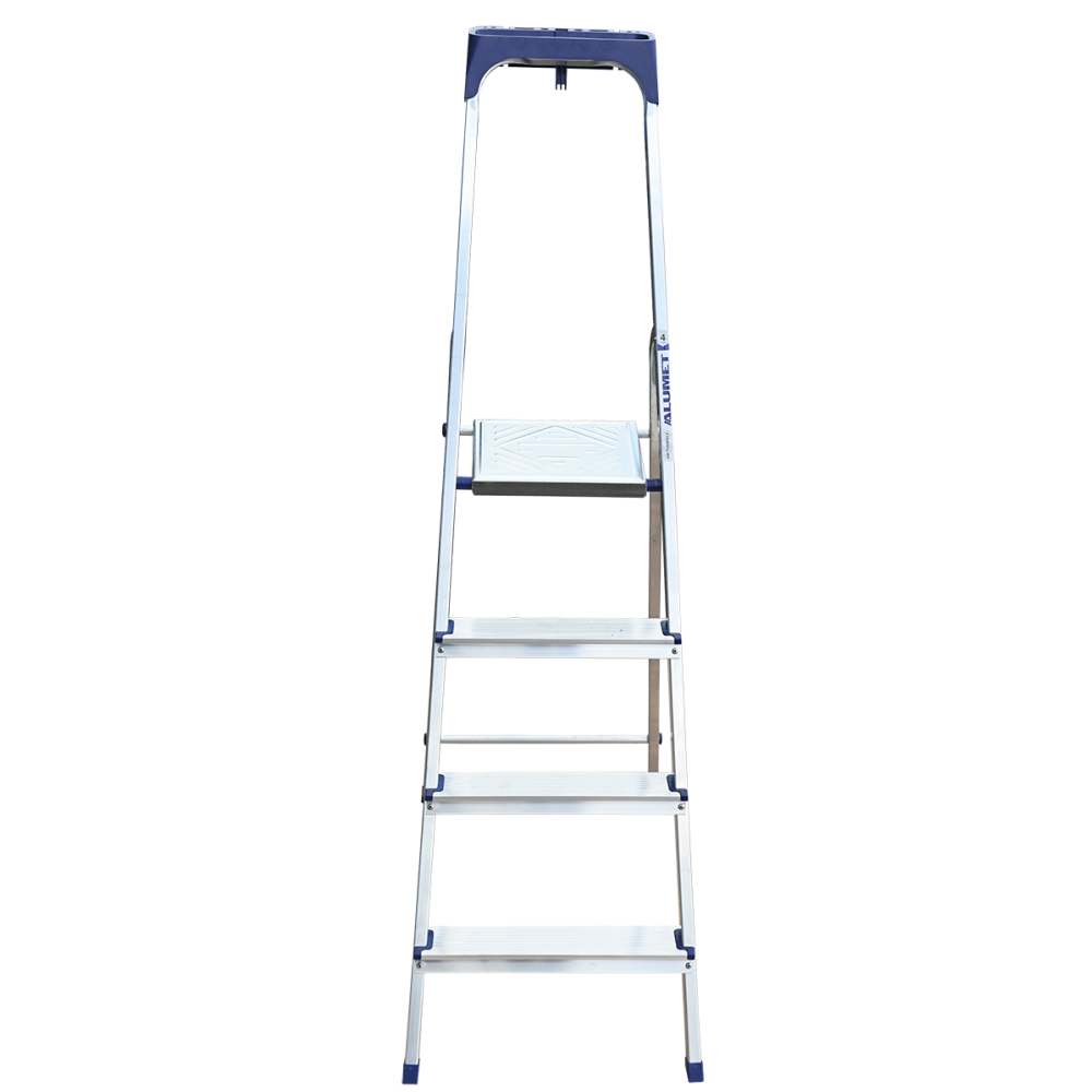 Стремянка алюминиевая изготовлена из высокопрочного алюминиевого профиля. Задняя и передняя нога соединены между собой. Рабочая площадка выполнена из оцинкованной стали. Ступени имеют рифленую поверхность. Башмаки изготовлены из высокопрочного пластика. Стремянка в рабочем положении надежно фиксируется рабочей площадкой, а начиная с пятиступенчатой и выше страховочными ремнями. Количество ступеней от 3-х до 10-и. Стремянка алюминиевая серии АМ 7xxAK011 предназначена для проведения различных видов работ на высоте до 4 м как в быту, так и на производстве.