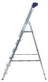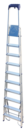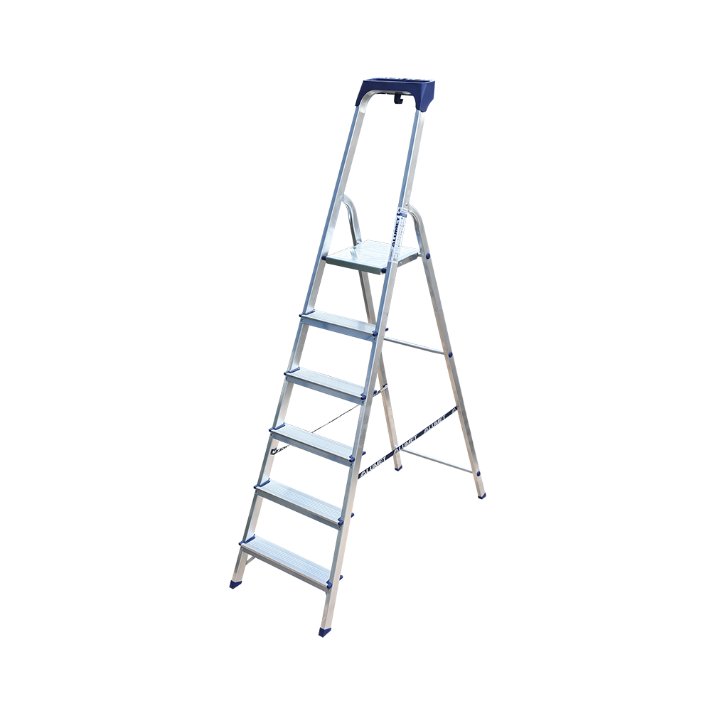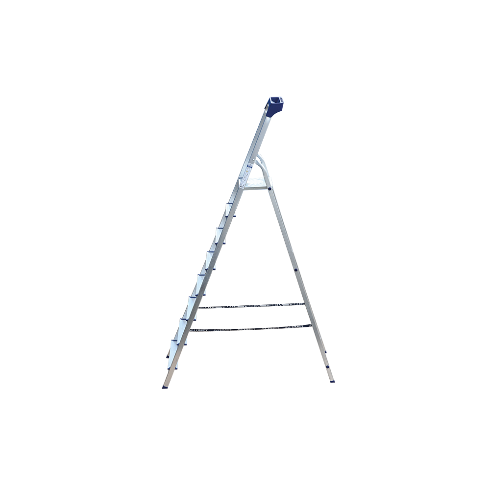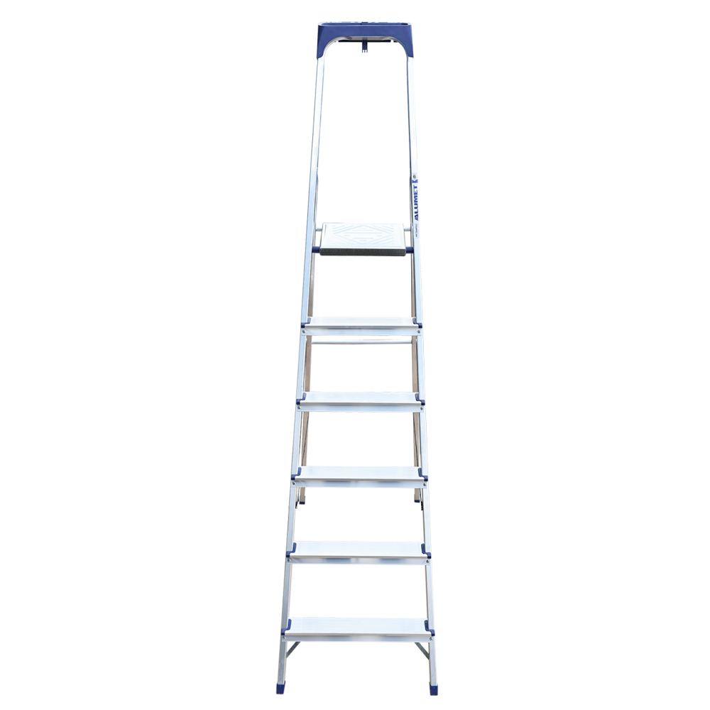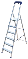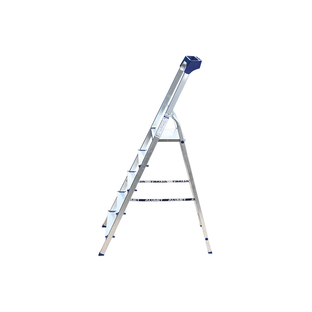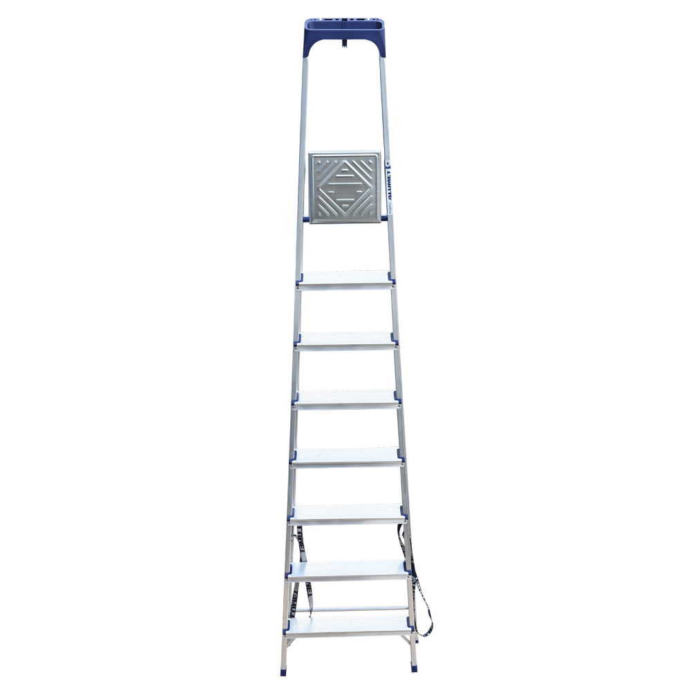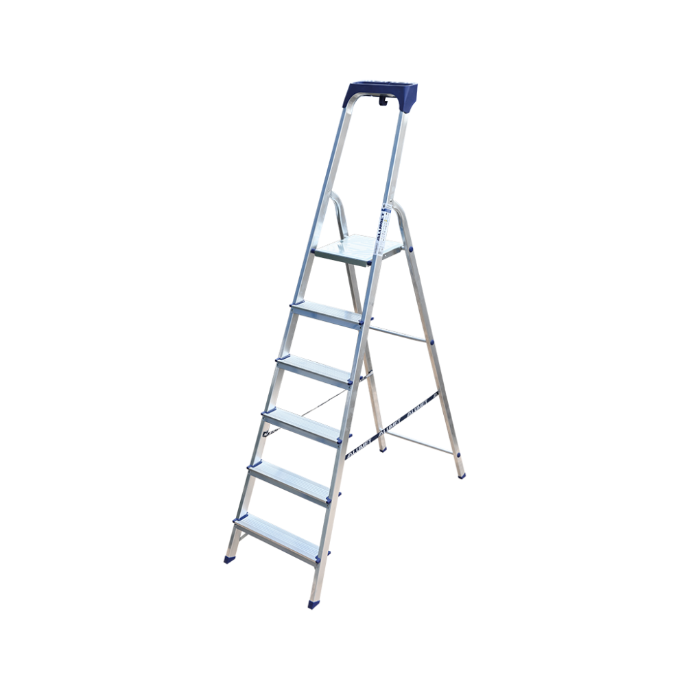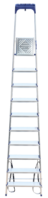Стремянка алюминиевая изготовлена из высокопрочного алюминиевого профиля. Задняя и передняя нога соединены между собой. Рабочая площадка выполнена из оцинкованной стали. Ступени имеют рифленую поверхность. Башмаки изготовлены из высокопрочного пластика. Стремянка в рабочем положении надежно фиксируется рабочей площадкой, а начиная с пятиступенчатой и выше страховочными ремнями. Количество ступеней от 3-х до 10-и. Стремянка алюминиевая серии АМ 7xxAK011 предназначена для проведения различных видов работ на высоте до 4 м как в быту, так и на производстве.