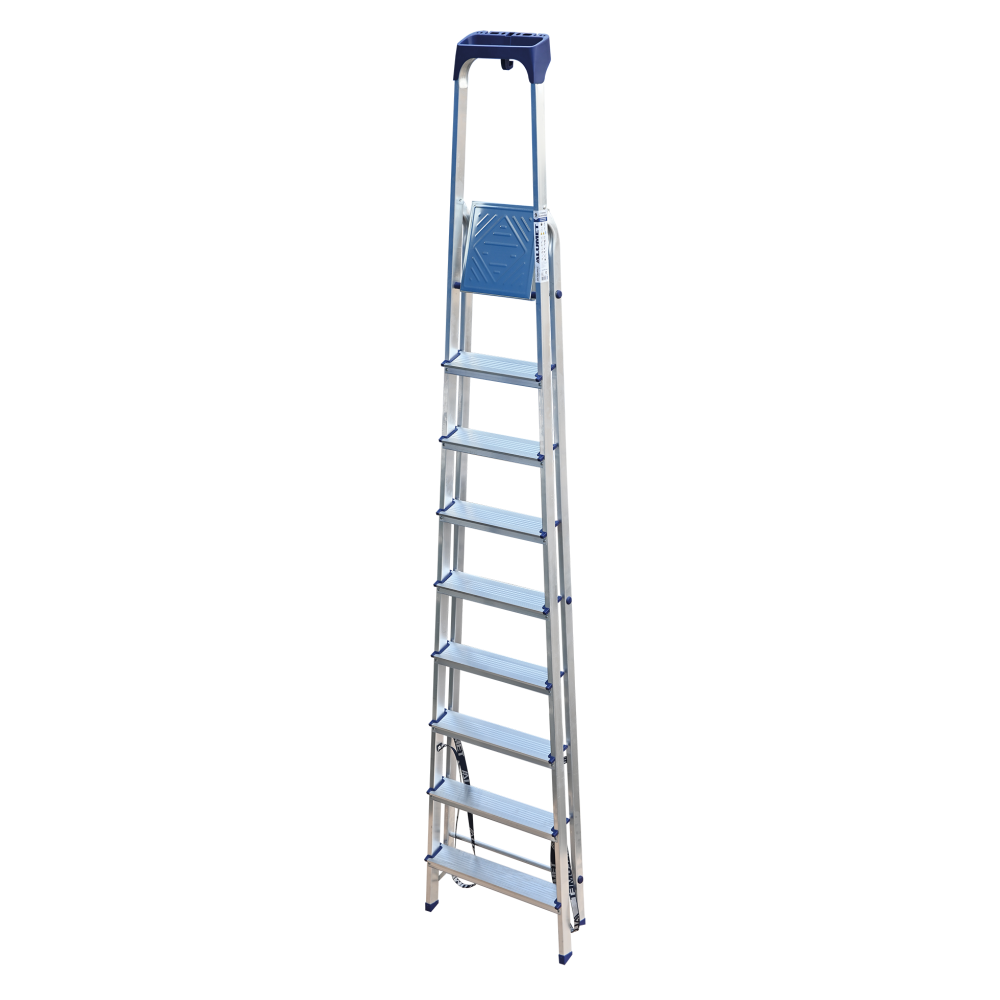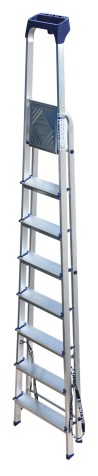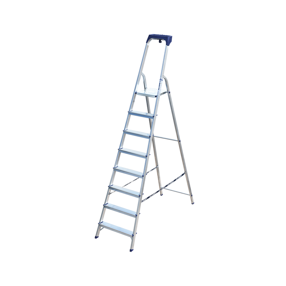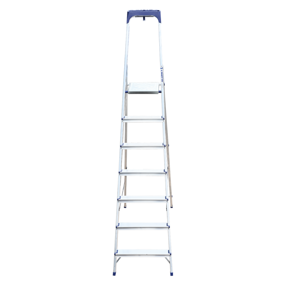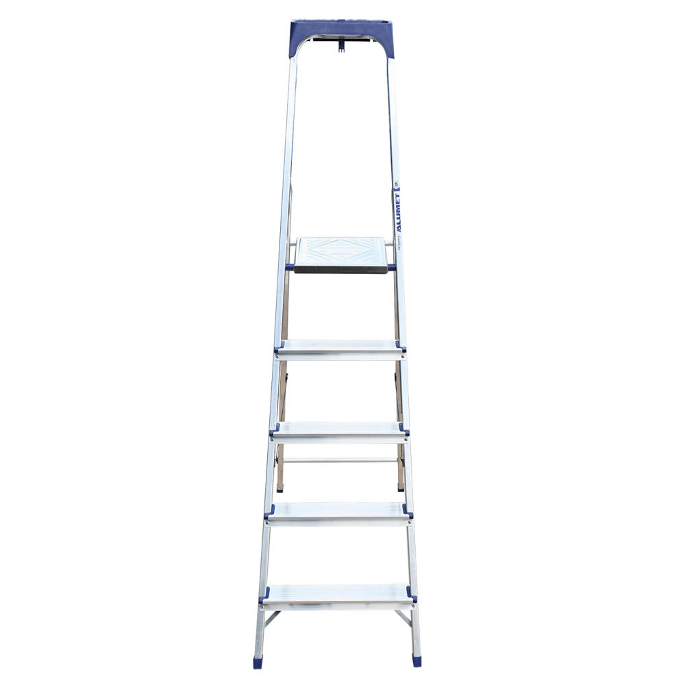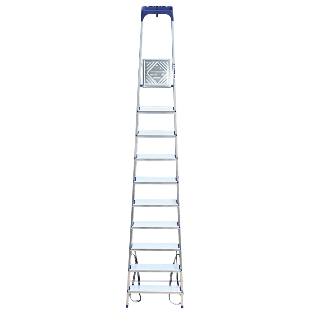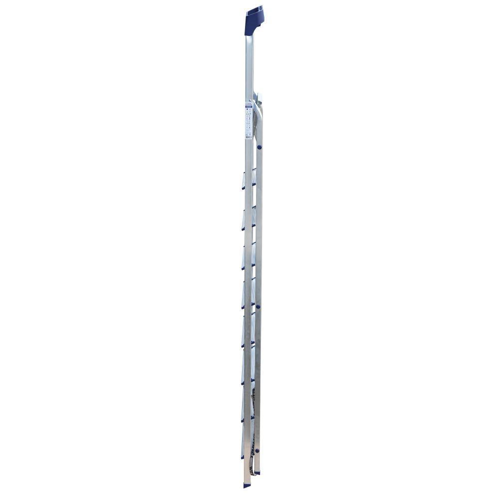 Стремянка алюминиевая изготовлена из высокопрочного алюминиевого профиля. Задняя и передняя нога соединены между собой. Рабочая площадка выполнена из оцинкованной стали. Ступени имеют рифленую поверхность. Башмаки изготовлены из высокопрочного пластика. Стремянка в рабочем положении надежно фиксируется рабочей площадкой, а начиная с пятиступенчатой и выше страховочными ремнями. Количество ступеней от 3-х до 10-и. Стремянка алюминиевая серии АМ 7xxAK011 предназначена для проведения различных видов работ на высоте до 4 м как в быту, так и на производстве.