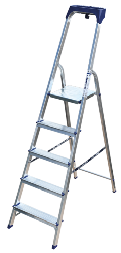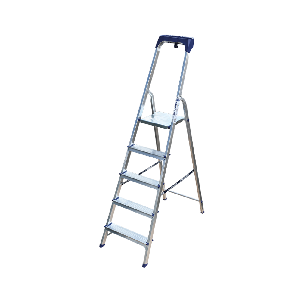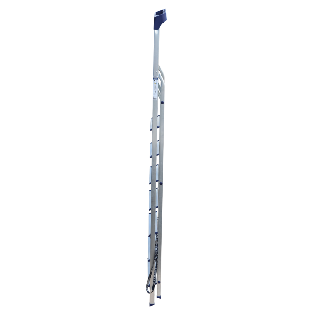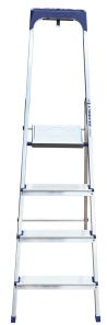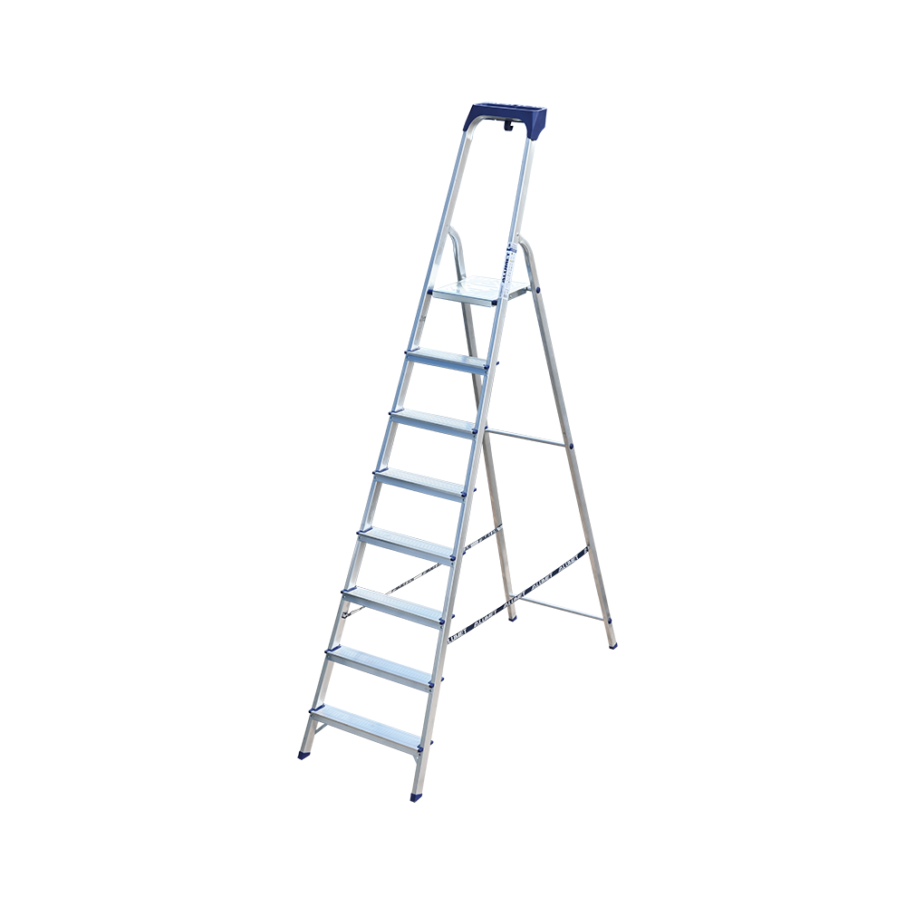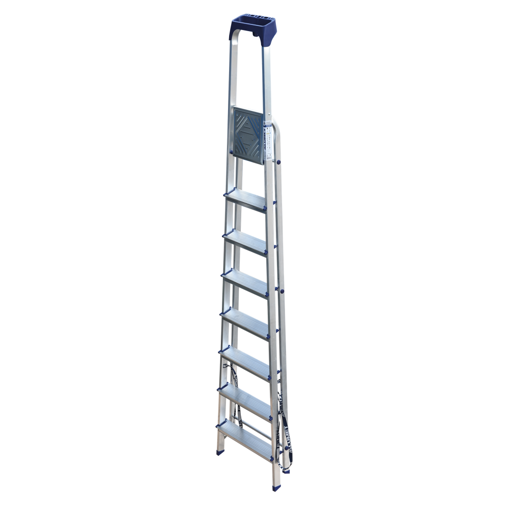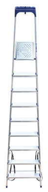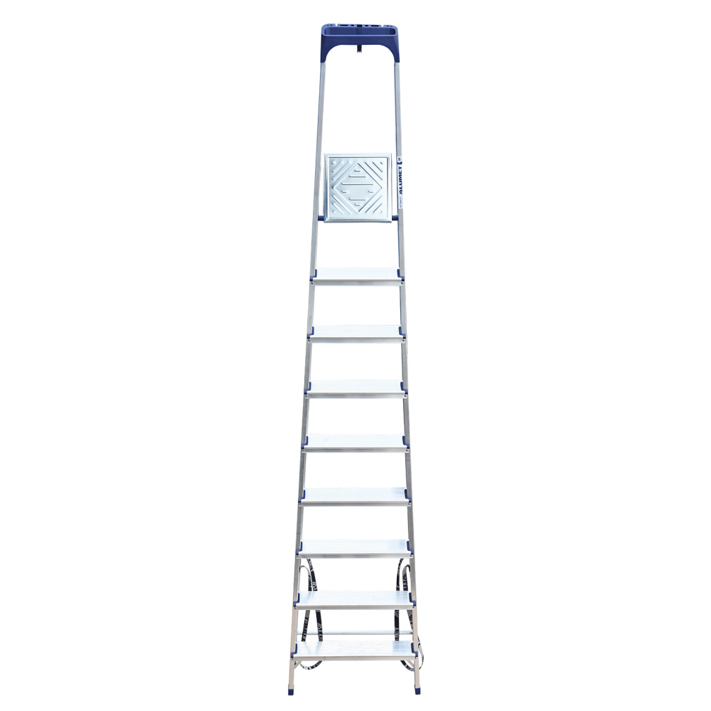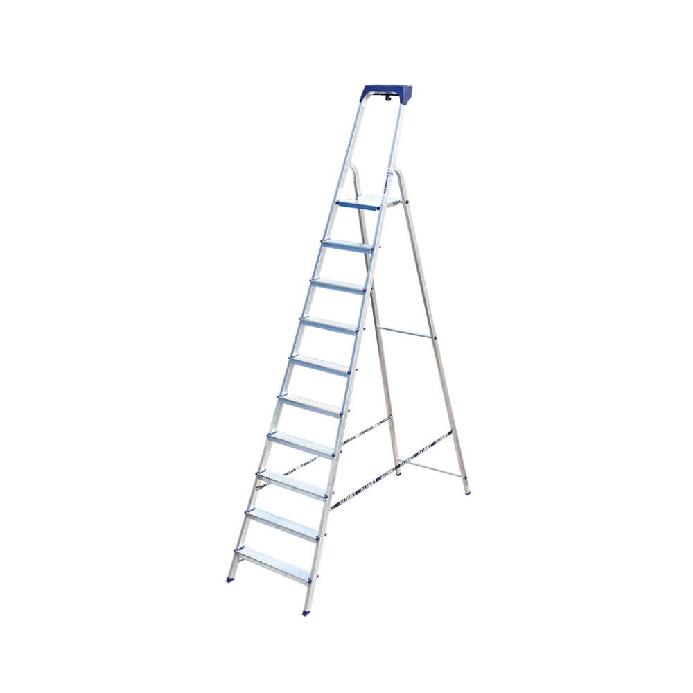 Стремянка алюминиевая изготовлена из высокопрочного алюминиевого профиля. Задняя и передняя нога соединены между собой. Рабочая площадка выполнена из оцинкованной стали. Ступени имеют рифленую поверхность. Башмаки изготовлены из высокопрочного пластика. Стремянка в рабочем положении надежно фиксируется рабочей площадкой, а начиная с пятиступенчатой и выше страховочными ремнями. Количество ступеней от 3-х до 10-и. Стремянка алюминиевая серии АМ 7xxAK011 предназначена для проведения различных видов работ на высоте до 4 м как в быту, так и на производстве.