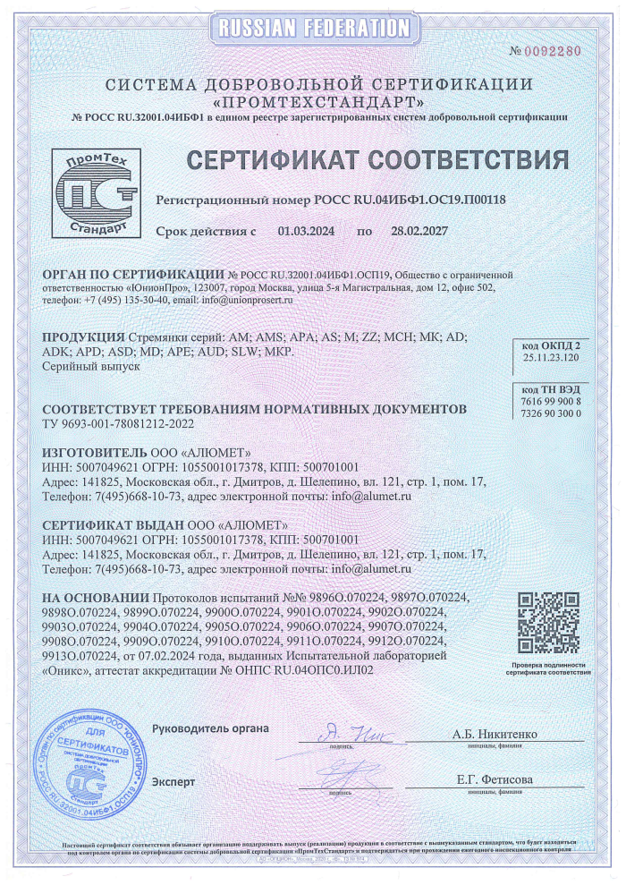 Тетива передней ноги, задняя нога и ступени выполнены из стального профиля, защищенного от коррозии порошковой краской. Задняя и передняя ноги соединены между собой, ступени соединены между собой осями-стяжками. Широкие ступени 30х20см имеют противоскользящий коврик «Vesta». На верхней ступени, для удобства при хранении и транспортировке, имеется пластиковая ручка. Для устойчивости на концах ног есть башмаки, изготовленные из высокопрочного пластика.