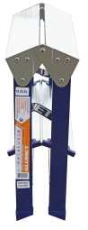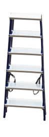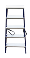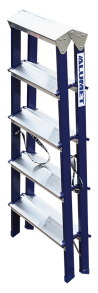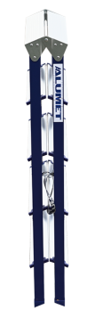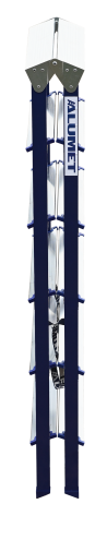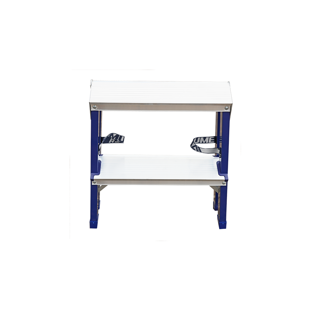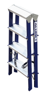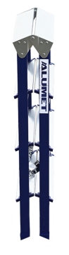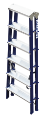 Стремянка фиксируется двумя страховочными ремнями. Тетивы стремянки изготовлены из прочного стального профиля, защищенного от коррозии эпоксидной порошковой эмалью. Ступени выполнены из высокопрочного алюминиевого профиля. Ступени имеют противоскользящую рифленую поверхность.
