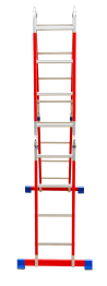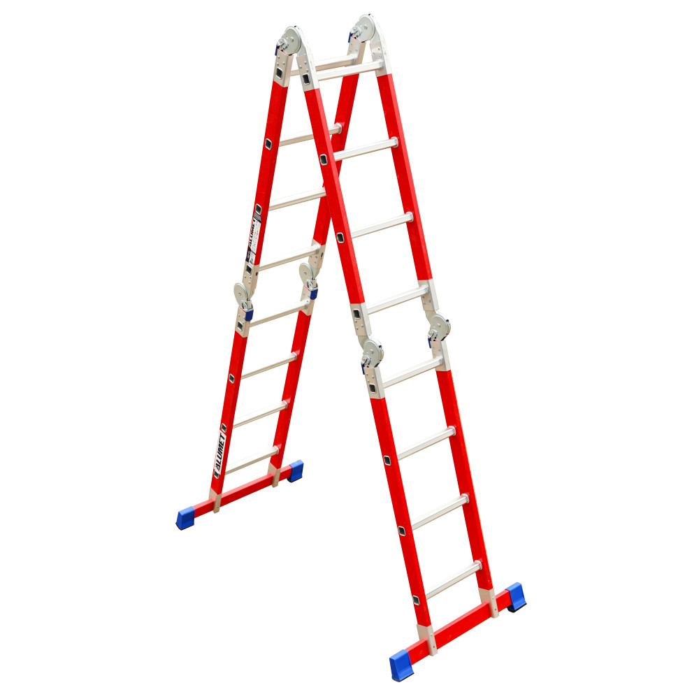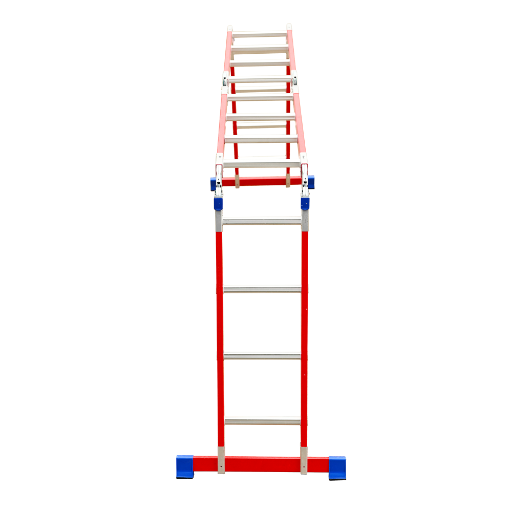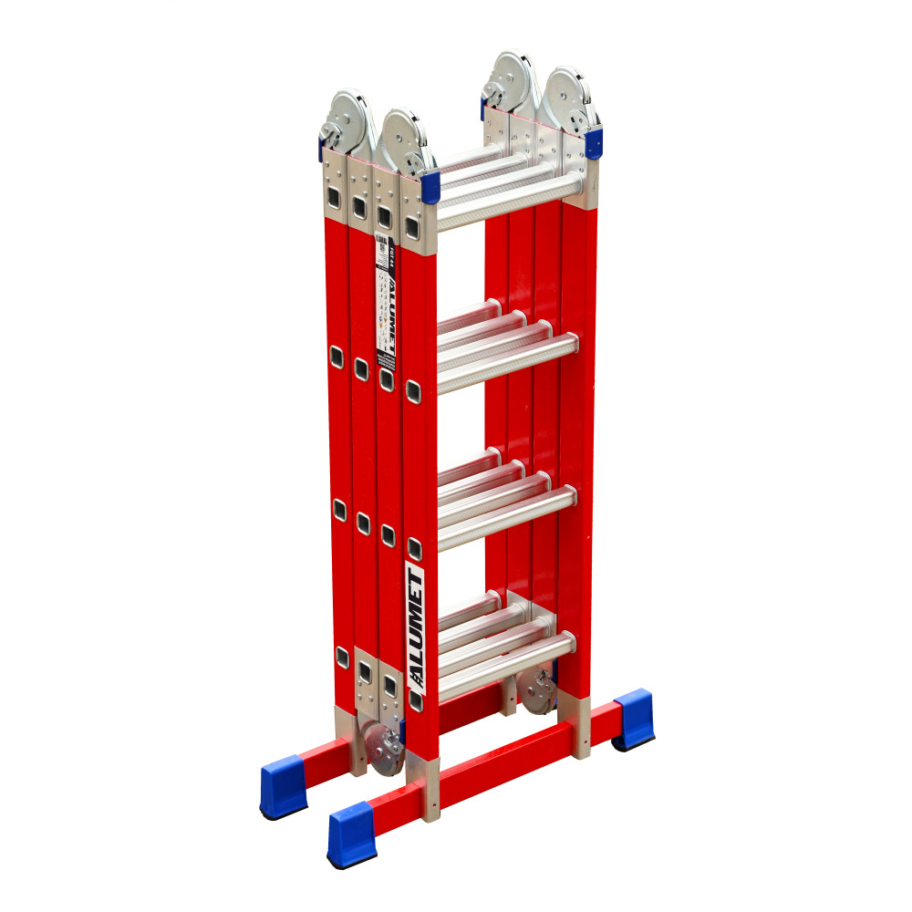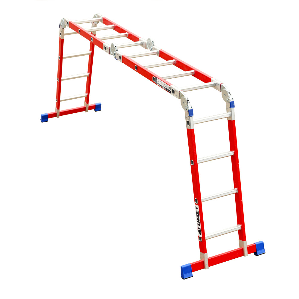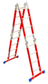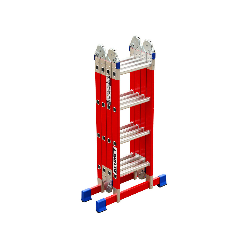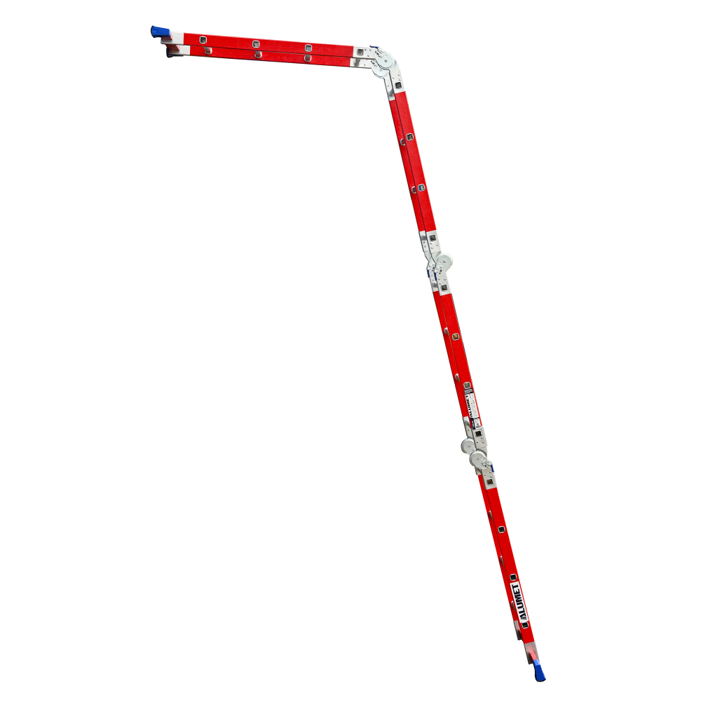 Лестница состоит из четырех секций, соединенных между собой стальными лестничными шарнирами с углами фиксации 35, 105 и 180 градусов. Поэтому такая лестница может принимать различные формы, такие как на рисунке.
